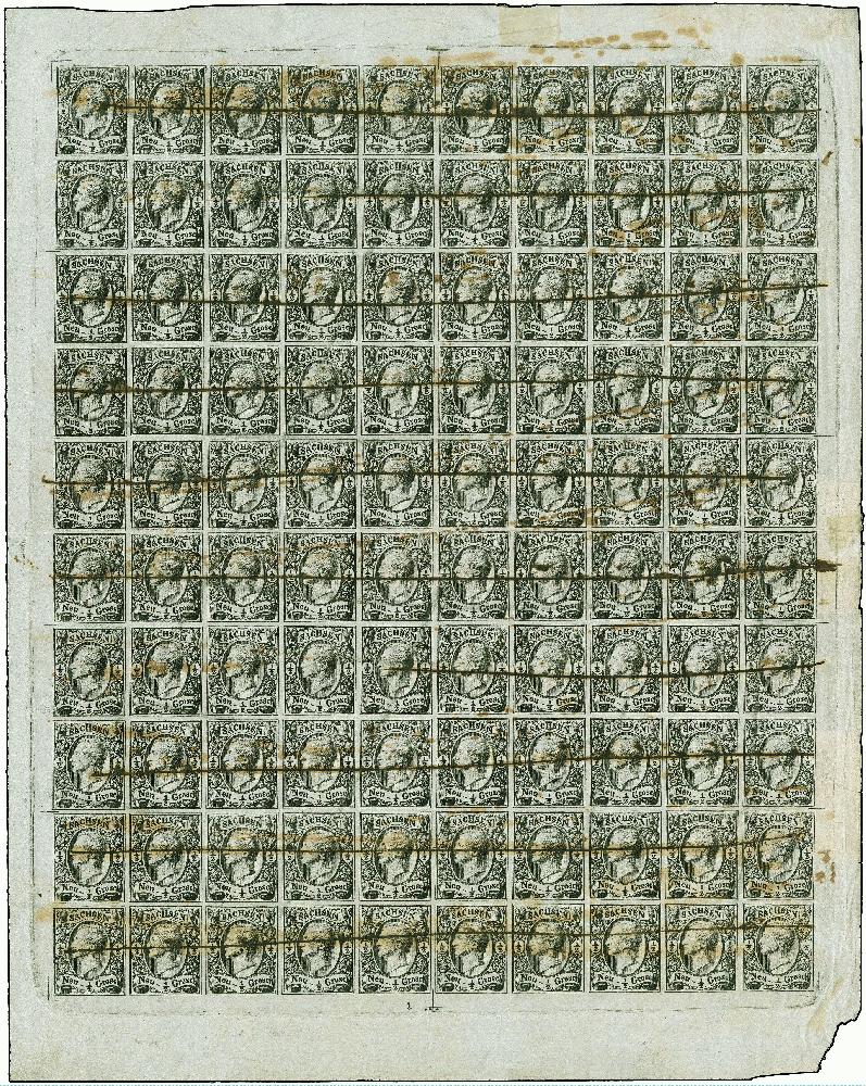 | Zusatzinformationen und Suchstichworte: | 382. Auktion Heinrich Köhler 18. – 23. September 2023 Los 4109 ½ Ngr. a. mattgraurot, Abzug des kompletten Bogens (wahrscheinlich Revisionsabzug zur Beurteilung der abgenutzten Platte) von 100 Werten auf dünnem grauen Pergamentpapier mit breiten Bogenrändern, reihenweise entwertet durch Tintenstriche; im Unterrand mit Plattennr. "1". Der Bogen ist einmal waagerecht zwischen den Marken gefaltet, kleine Einrisse im Bogenrand rechts hinterlegt, sonst insgesamt gute Erhaltung. Ein interessantes und seltenes Stück. Fotoattest Vaatz BPP (2022) Ausruf 500,00 EUR |
