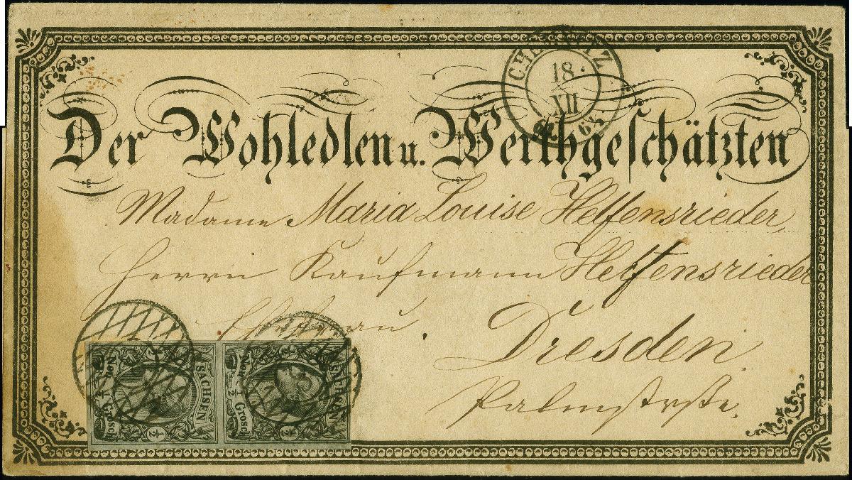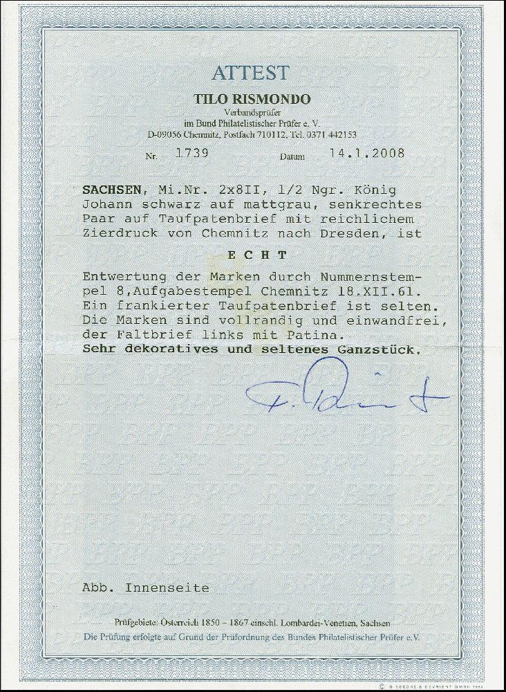 | Zusatzinformationen und Suchstichworte: | 382. Auktion Heinrich Köhler 18. – 23. September 2023 Los 4110 ½ Ngr. auf mattgrau im senkrechten Paar, allseits- vollrandig geschnitten mit klarer Nummer "8" CHEMNITZ auf dekorativem Zierbrief (Taufpatenbrief) mit nebengesetztem DKr. "CHEMNITZ 18.XII.61" nach Dresden, der Faltbrief unten links gering fleckig, sonst tadellos, frankierte Taufpatenbriefe sind selten, da sie gewöhnlich persönlich übergeben wurden, Fotoattest Rismondo BPP (2008) Ausruf 250,00 EUR |