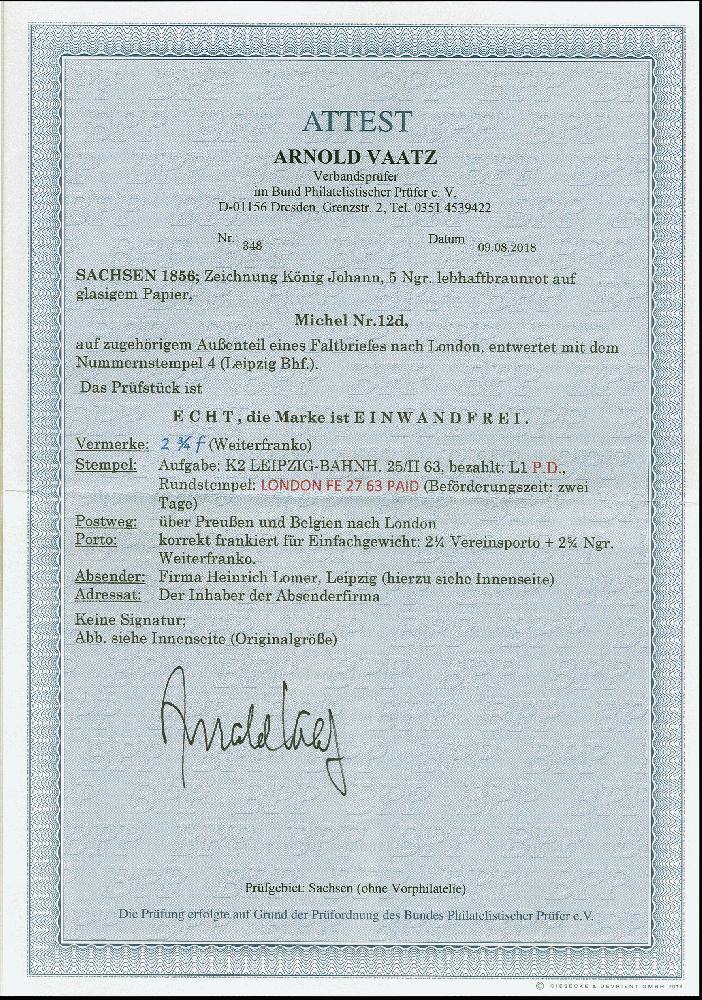 | Zusatzinformationen und Suchstichworte: | 382. Auktion Heinrich Köhler 18. – 23. September 2023 Los 4113 5 Ngr. lebhaftbraunrot, farbfrisch und allseits vollrandig geschnitten, kleiner Aufklebeknitter, sauber mit Nummer "4" und nebengesetztem Aufgabestempel "LEIPZIG-BAHNHOF 25 /II" auf Briefhülle mit ausgewiesenem Weiterfranko "2 3/4" nach London, die rosabraune Nuance ist auf Brief selten, Fotoattest Rismondo BPP (2008) sowie Vaatz BPP (2018) Ausruf 500,00 EUR |