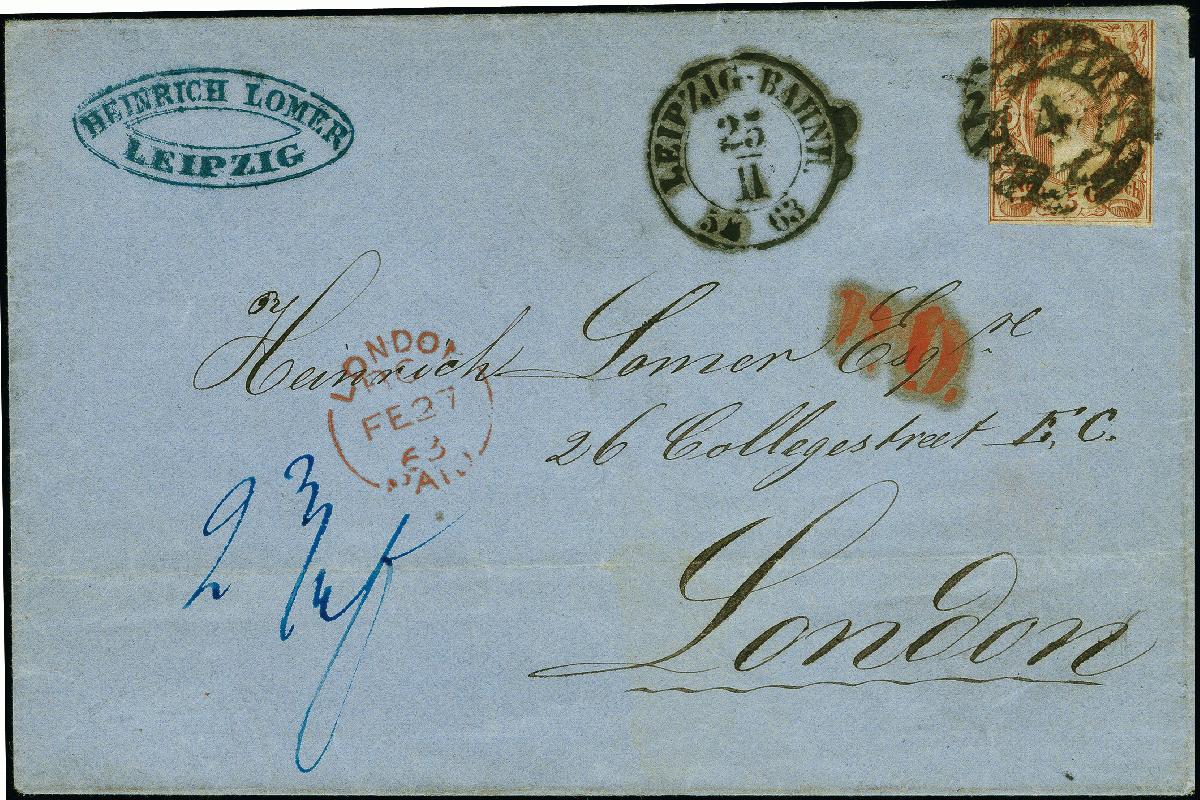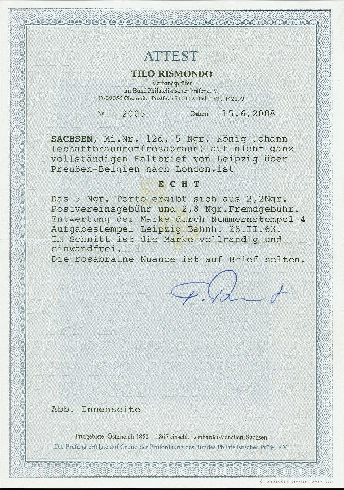 | Zusatzinformationen und Suchstichworte: | 382. Auktion Heinrich Köhler 18. – 23. September 2023 Los 4113 5 Ngr. lebhaftbraunrot, farbfrisch und allseits vollrandig geschnitten, kleiner Aufklebeknitter, sauber mit Nummer "4" und nebengesetztem Aufgabestempel "LEIPZIG-BAHNHOF 25 /II" auf Briefhülle mit ausgewiesenem Weiterfranko "2 3/4" nach London, die rosabraune Nuance ist auf Brief selten, Fotoattest Rismondo BPP (2008) sowie Vaatz BPP (2018) Ausruf 500,00 EUR |