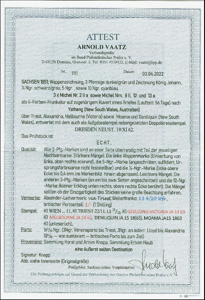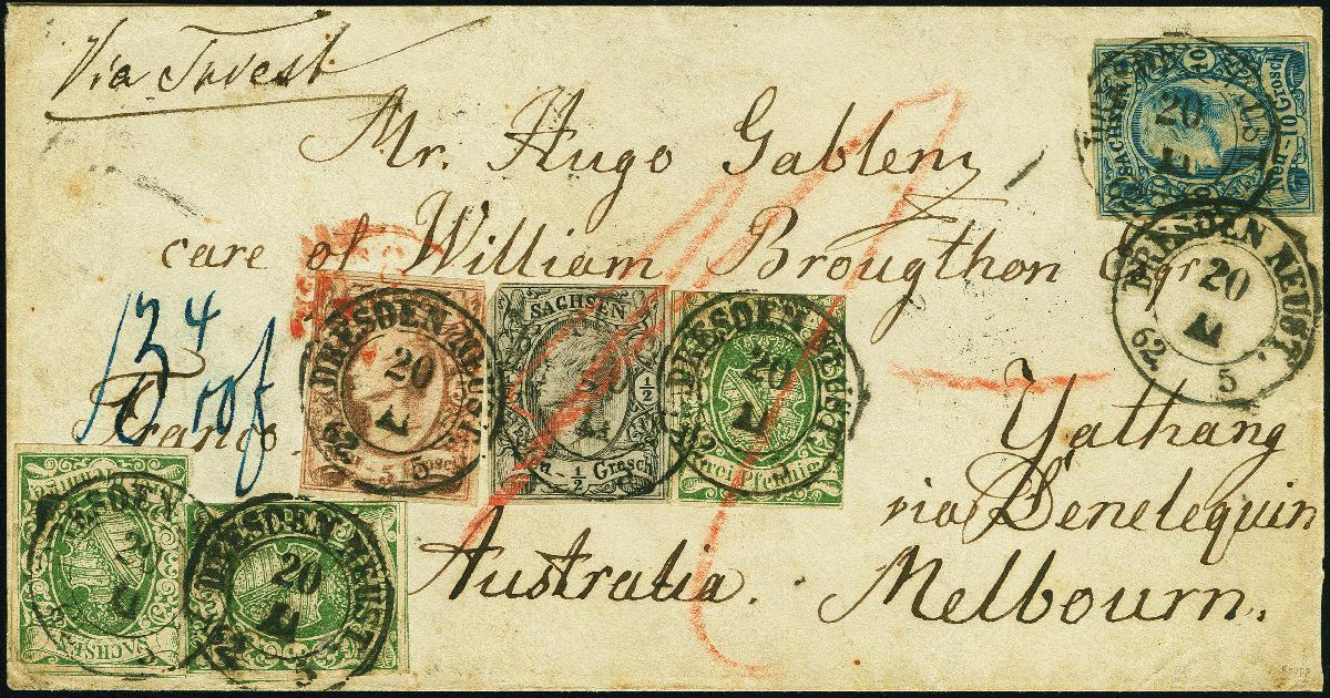 | Zusatzinformationen und Suchstichworte: | 382. Auktion Heinrich Köhler 18. – 23. September 2023 Los 4116 Johann 10 Ngr. blau, 5 Ngr. ziegelrot (sulfidiert) und ½ Ngr. a. grau, zusammen mit 3 Einzelwerten Wappen 3 Pfg. grün als korrekte 13 4/10 Neugroschen-Frankatur auf 3seitig geöffnetem Briefkuvert von "DRESDEN NEUST. 20 XI 62" nach Yathang bei Denelequin, Neu Südwales. Der Brief wurde befördert via Triest und Alexandria mit der Overland Mail, rückseitig mit diversen Transitstempeln. Die Frankatur durch die Beförderung kleine Beanstandungen bzw. bereits teils leicht defekt aufgeklebt. Ein sehr attraktiver Brief und mit der Destination Australien von größter Seltenheit. Ausruf 12.000,00 EUR |