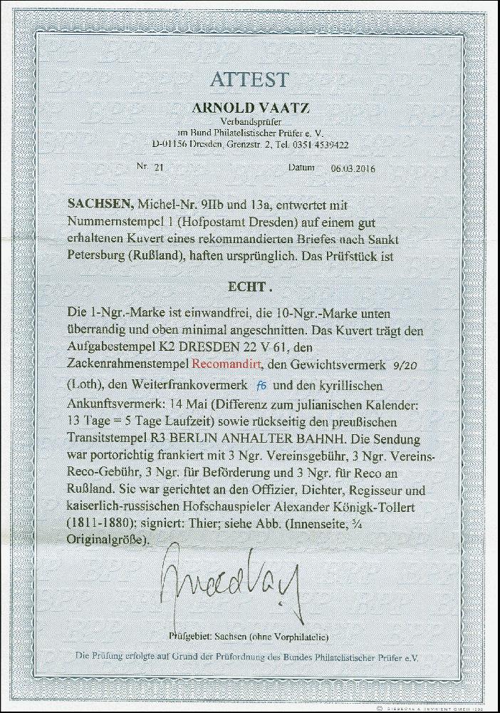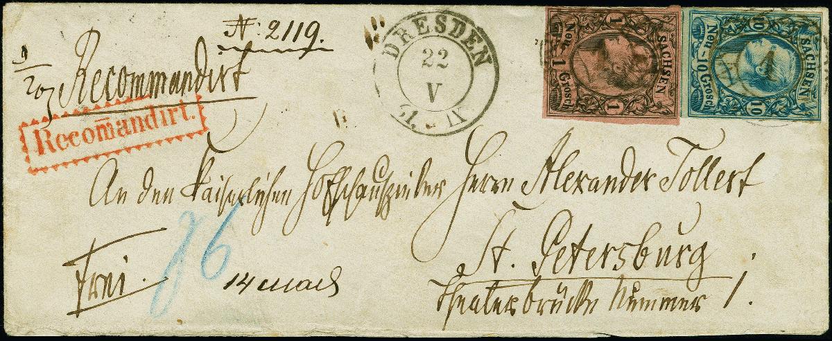 | Zusatzinformationen und Suchstichworte: | 382. Auktion Heinrich Köhler 18. – 23. September 2023 Los 4118 10 Ngr. milchblau und 1 Ngr. a. hellrötlichkarmin, die 10 Ngr. oben etwas in die Randlinie geschnitten und kleine Beförderungsspuren, sonst beide voll- bis breitrandig und einwandfrei, mit Nr. "1" und nebengestztem DKr. "DRESDEN 23/V 61" auf eingeschriebenem Briefkuvert nach St. Petersburg mit rückseitigem Durchgangsstempel "BERLIN ANHALTER BAHNHOF". Das Porto setzt sich zusammen aus jeweils 3 Neugroschen Vereinsporto und russischem Porto, welches für die Rekommandation verdoppelt wurde, dazu kommen 2 Neugroschen sächsische Reko-Gebühr. Ein seltener Brief aus der bekannten Korrespondenz an den kaiserlichen Hofschauspieler und Direktor des deutschen Theaters in St. Petersburg, Alexander Königk-Tollert. Fotoattest Vaatz BPP (2016) Ausruf 600,00 EUR |