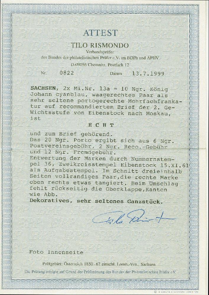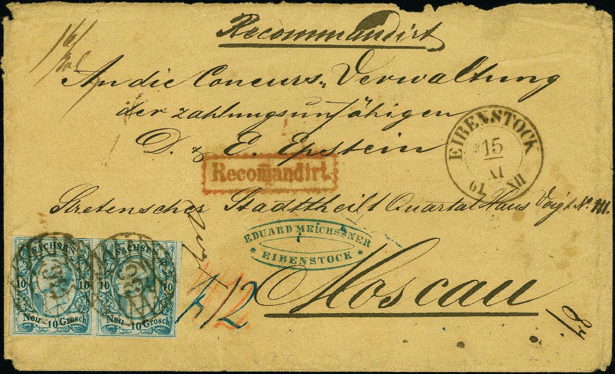 | Zusatzinformationen und Suchstichworte: | 382. Auktion Heinrich Köhler 18. – 23. September 2023 Los 4119 10 Ngr. blau im waagerechten Paar, farbfrisch und meist voll- bis breitrandig, lediglich oben rechts etwas berührt, mit sauber aufgesetzter Nummer "36" und nebengesetztem Aufgabestempe "EIBENSTOCK 15/XI" auf eingeschriebenem Briefkuvert nach Moskau. Das Porto setzt sich zusammen aus je 6 Ngr. Postvereins- und russischem Porto für die 2. Gewichtsstufe, 2 Ngr. vereinsländische Recommandationsgebühr sowie 6 Ngr. russische Recommandationsgebühr (doppelter Betrag der einfachen Briefportotaxe), entsprechend sind 12 Neugroschen Weiterfranko in blau vermerkt, die rückseitige Klappe fehlt und im Rand des Kuverts Transportspuren, eine seltene und attraktive Mehrfachfrankatur, Fotoattest Rismondo BPP (1999) Ausruf 800,00 EUR |