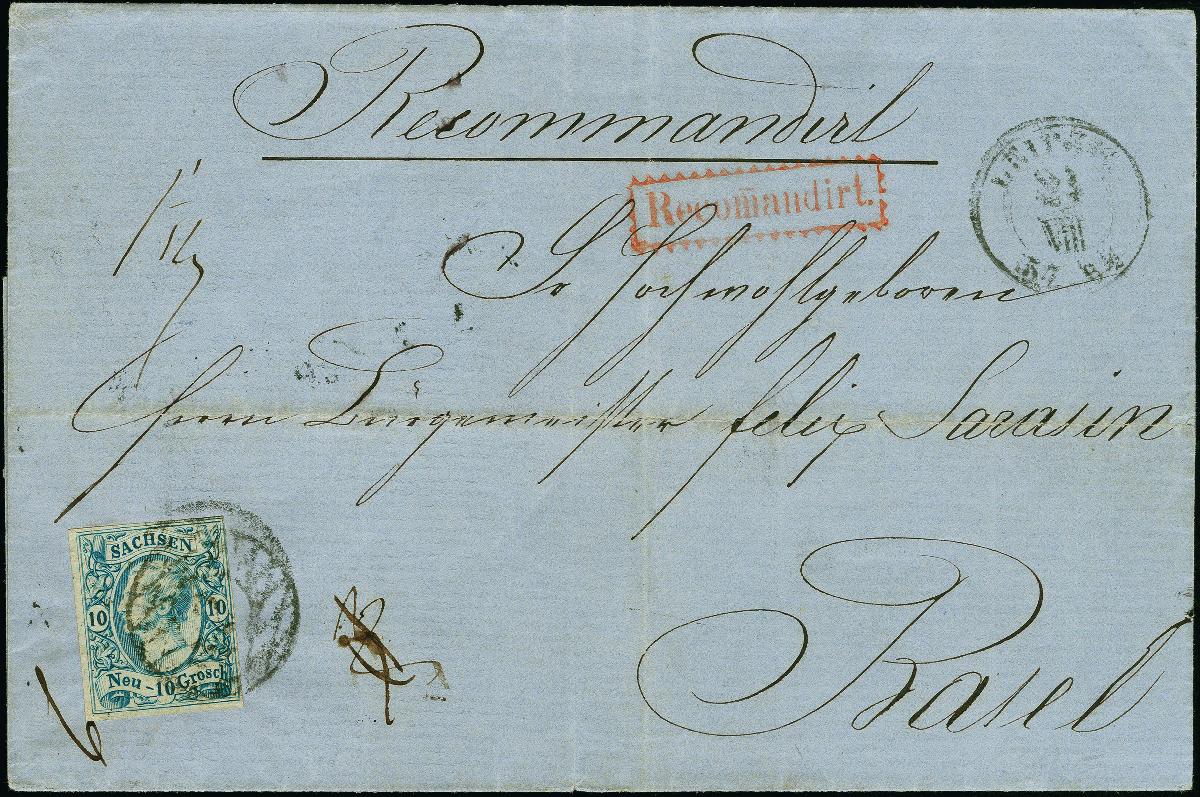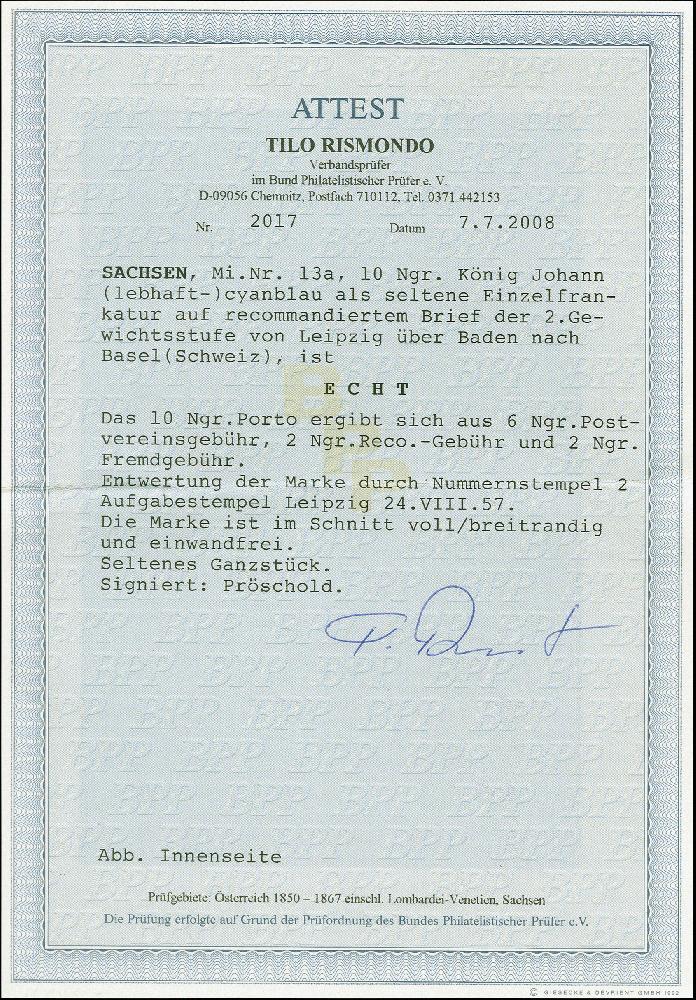 | Zusatzinformationen und Suchstichworte: | 382. Auktion Heinrich Köhler 18. – 23. September 2023 Los 4122 10 Ngr. cynablau, farbfrisch und allseits voll- bis breitrandig geschnitten, mit Nummer "2" und nebengesetztem Aufgabestempel "LEIPZIG 24 VIII" auf eingeschriebener Briefhülle nach Basel, tadellos, eine seltene Frankatur, sign. Pröschold und Fotoattest Rismondo BPP (2008) Ausruf 400,00 EUR |