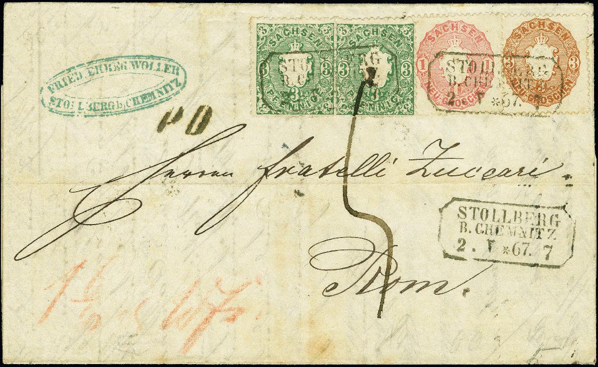 | Zusatzinformationen und Suchstichworte: | 382. Auktion Heinrich Köhler 18. – 23. September 2023 Los 4127 3 Pfg. grün, zwei Einzelwerte zusammen mit 1 Ngr. Lebhaftlilarot und 3 Ngr. braunorange, alle farbfrisch und gut gezähnt, mit sauber auf- und nebengesetztem Rahmenstempel "STOLBERG B. CHEMNITZ 2.V *67" auf Faltbrief über Triest nach Rom im Kirchenstaat. Das Weiterfranko bis zur Grenze des Kirchenstaates ist vorderseitig in Rötel mit "1 6/10 wf" notiert, weitere "5" Bajochi wurden vom Empfänger eingezogen. Die beiden 3 Pfennig-Marken waren gelöst und wurden mit falzartiger Verstärkung wieder aufgeklebt, sonst einwandfrei. Ein attraktiver und seltener Brief. Fotoattest Vaatz BPP (2022) Ausruf 700,00 EUR |