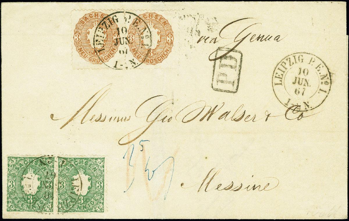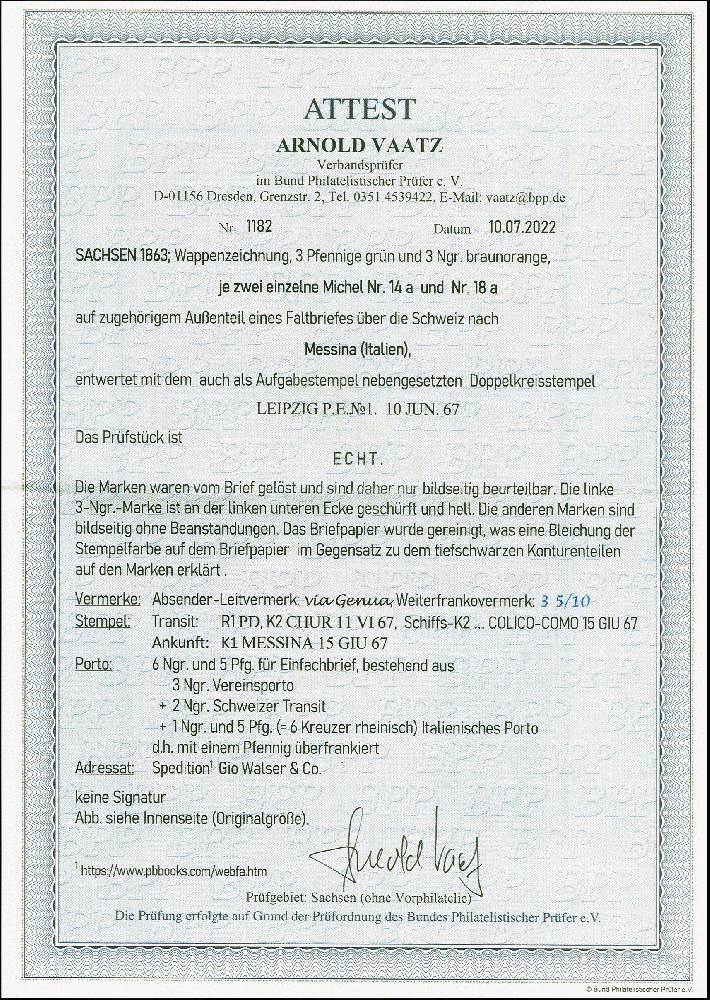 | Zusatzinformationen und Suchstichworte: | 382. Auktion Heinrich Köhler 18. – 23. September 2023 Los 4129 3 Pfg. grün und 3 Ngr. braunorange, alle farbfrisch und gut gezähnt, mit sauber auf- und nebengesetztem Doppelkreisstempel "LEIPZIG 10 JUN 67" auf Briefhülle über die Schweiz nach Messina im Königreich Italien. Die Frankatur war gelöst, der Brief gereinigt, sonst bis auf kleine Eckschürfung bei einer 3 Ngr. einwandfrei. Fotoattest Vaatz BPP (2022) Ausruf 700,00 EUR |
