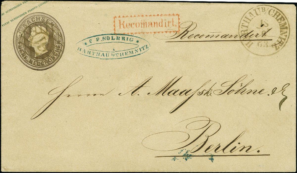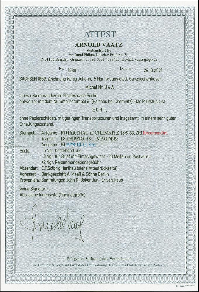| Zusatzinformationen und Suchstichworte: | 382. Auktion Heinrich Köhler 18. – 23. September 2023 Los 4132 1859, Umschlag 5 Ngr. braunviolett, entwertet mit Nummer „61“, und mit nebengesetztem Einkreisstempel „HARTHAU B/CHEMNITZ 18/9 63“ als Charge-Brief nach Berlin. Schöne und einwandfreie Erhaltung, Fotoattest Vaatz BPP (2021) Ausruf 200,00 EUR |