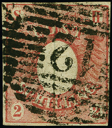 | Zusatzinformationen und Suchstichworte: | 382. Auktion Heinrich Köhler 18. – 23. September 2023 Los 4136 2 Schilling dunkelrosa, farbfrisch und voll- bis meist breitrandig, sauber entwertet durch zentrischen Roststempel "12" HAMBURG. Tadellos. Ein schönes Stück der seltenen Farbnuance. Signiert Thier, Fotoattest Möller BPP (2022) Ausruf 3.000,00 EUR |
