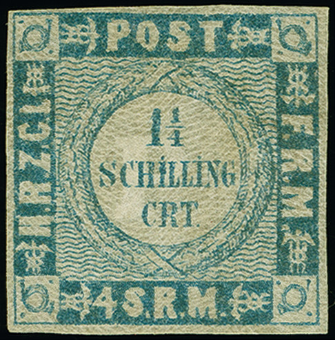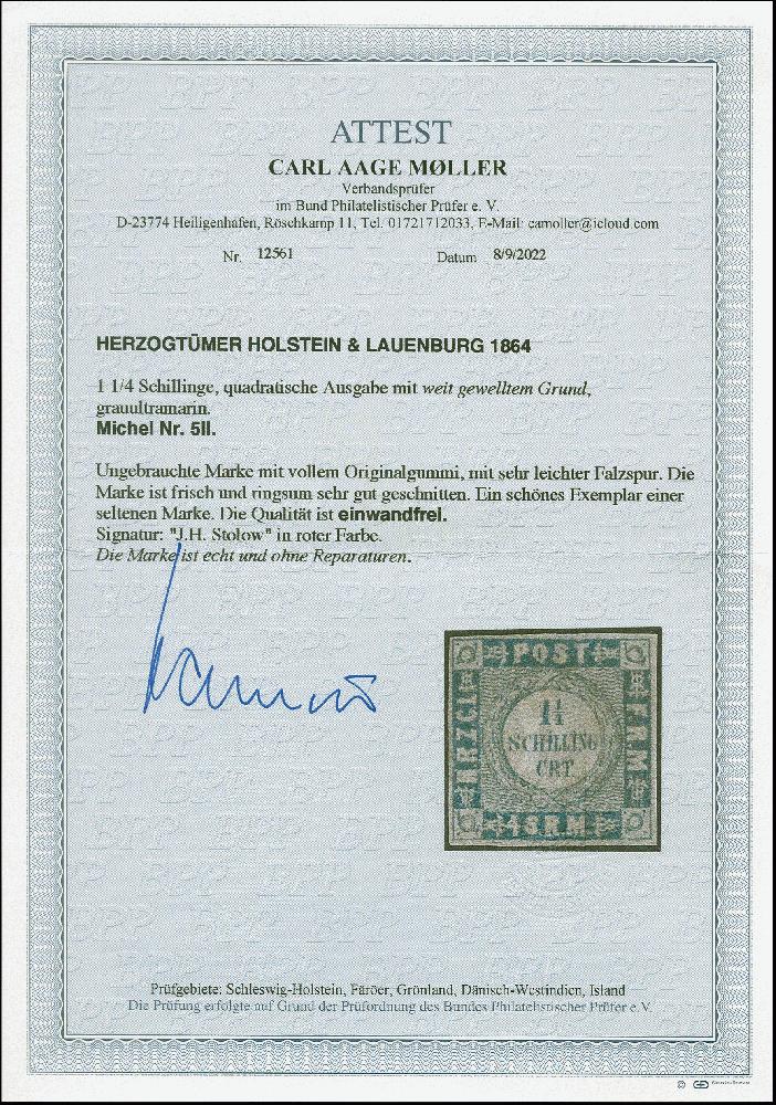 | Zusatzinformationen und Suchstichworte: | 382. Auktion Heinrich Köhler 18. – 23. September 2023 Los 4137 Weit gewellter Grund 1¼ Schilling grauultramarin, farbfrisch und voll- bis breitrandig, ungebraucht mit Originalgummi, einwandfrei. Signiert Stolow und Fotoattest Möller BPP (2022) Ausruf 200,00 EUR |