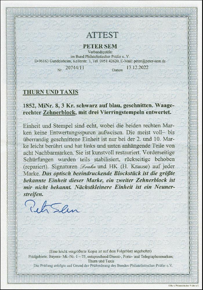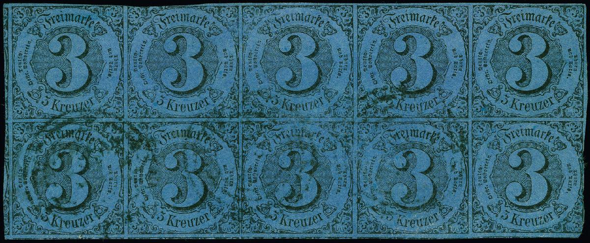 | Zusatzinformationen und Suchstichworte: | 382. Auktion Heinrich Köhler 18. – 23. September 2023 Los 4143 1852, 3 Kr. auf dunkelblau im waagerechten 10er-Block, farbfrisch, lediglich an zwei Stellen etwas berührt, sonst voll- bis überrandig mit Teilen von 8 Nachbarmarken, leicht gestempelt. Vorder- und rückseitige Schürfungen wurden kunstvoll restauriert, sonst in einwandfreier Erhaltung. Größte gestempelte Einheit dieser Marke und eine der größten Einheiten der Ausgaben auf farbigem Papier. Signiert Drahn, H. Krause und Grobe, Fotoattest Sem BPP (2022) Ausruf 5.000,00 EUR |