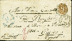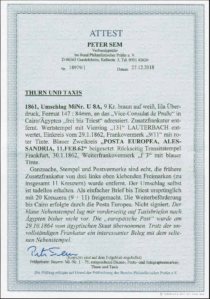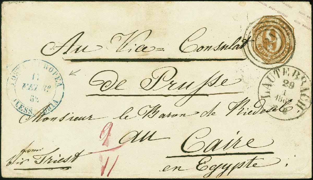| Zusatzinformationen und Suchstichworte: | 382. Auktion Heinrich Köhler 18. – 23. September 2023 Los 4148 1861, Umschlag 9 Kr. braun mit Nr. "131" und sauber nebengesetztem EKr. "LAUTERBACH 29 1 1862" nach Kairo mit Leitvermerk via Triest. Ab Alexandria wurde der Brief befördert mit der Privatpost 'Posta Europea' mit vorderseitig sauber abgeschlagenem blauem DKr.. Drei zufrankierte Werte abgefallen, sonst einwandfrei. Es ist nur ein weiterer Taxis-Brief nach Ägypten mit Weiterbeförderung durch die 'Posta Europea' registriert. Fotoattest Sem BPP (2018) Ausruf 700,00 EUR |