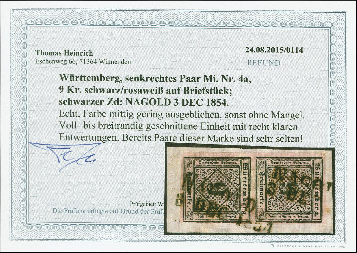 | Zusatzinformationen und Suchstichworte: | 382. Auktion Heinrich Köhler 18. – 23. September 2023 Los 4165 9 Kr. a. rosaweiß, senkrechtes Paar, voll- bis breitrandig, mit jeweils sauber aufgesetztem L2 "NAGOLD 3 DEC 1854" auf kleinem Briefstück. In der Mitte unauffällig gering ausgeblichen, sonst tadellos. Ein attraktives und seltenes Paar. Fotobefund Heinrich BPP (2015) Ausruf 180,00 EUR |