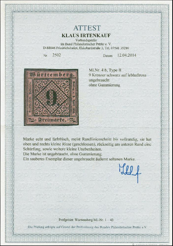 | Prüfer: | Irtenkauf, Klaus (BPP (Bund Philatelistischer Prüfer)) |