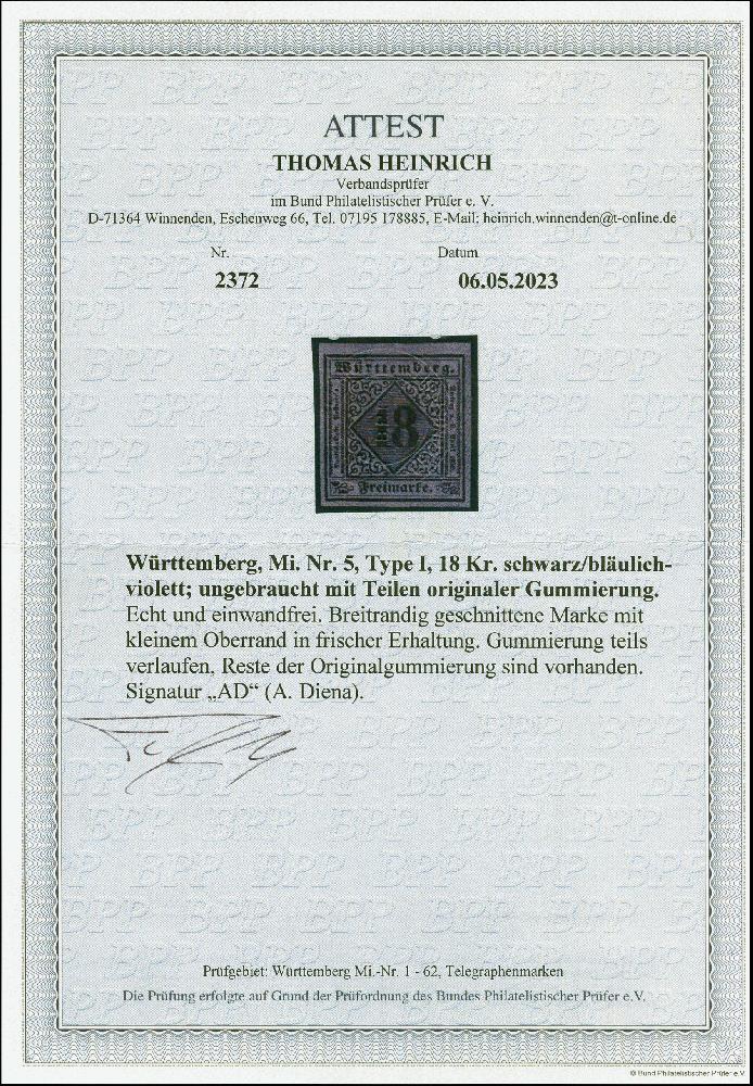 | Zusatzinformationen und Suchstichworte: | 382. Auktion Heinrich Köhler 18. – 23. September 2023 Los 4168 18 Kr. bläulichviolett, farbfrisch und allseits breitrandig geschnitten mit kleinem Oberrand, sauber ungebraucht mit etwas verlaufener Originalgummierung, tadellos, eine seltene Marke, sign. A. Diena sowie Fotoattest Heinrich BPP (2023) Ausruf 450,00 EUR |