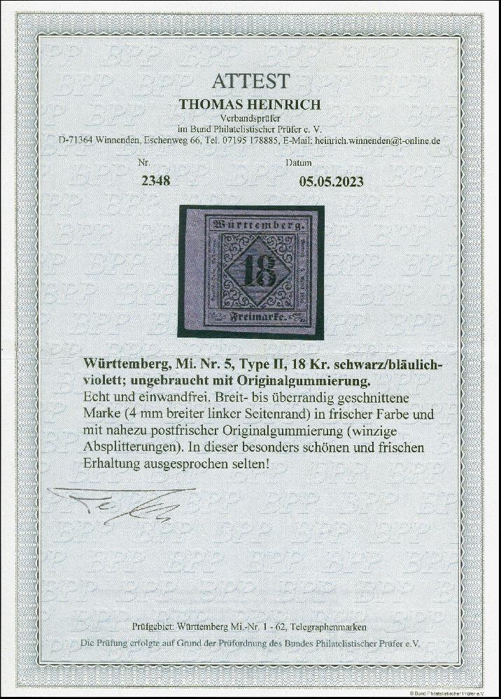 | Zusatzinformationen und Suchstichworte: | 382. Auktion Heinrich Köhler 18. – 23. September 2023 Los 4172 1851, 18 Kr. bläulichviolett, farbfrisch, allseits breit- bis überrandig geschnitten mit 4 mm breitem linken Seitenrand, ungebraucht mit nur einer winzigen Gummiabsplitterung, eine in dieser besonders schönen Erhaltung ausgesprochen seltene Marke, unsigniert mit Fotoattest Heinrich BPP (2023) Ausruf 500,00 EUR |