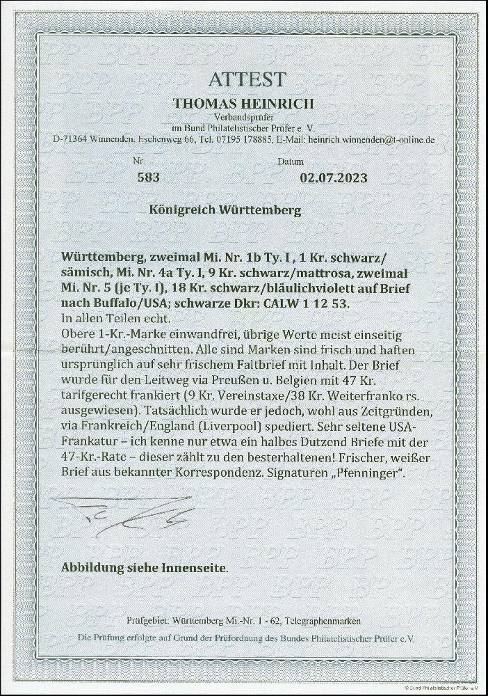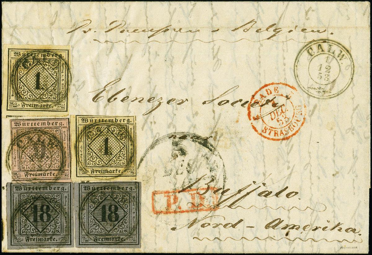 | Zusatzinformationen und Suchstichworte: | 382. Auktion Heinrich Köhler 18. – 23. September 2023 Los 4175 1851, 18 Kr. bläulichviolett sowie 1 Kr. auf sämisch, je zwei Einzelwerte, sowie 9 Kr. auf mattrosa, alle Marken sehr schön farbfrisch, meist einseitig berührt, mit DKr. "CALW 1 12 53" ursprünglich auf weißem Faltbrief mit Leitvermerk "pr. Preußen - Belgien" nach Buffalo haftend, dennoch wohl aus Zeitgründen via Frankreich mit rotem Transitstempel "BADE STRASBOURG 3 DEC 53" speditiert, rückseitig mit ausgewiesenem Weiterfranko "38". Einer der schönsten Briefe aus dieser bekannten Korrespondenz mit der seltenen 47 Kreuzer-Rate, insgesamt sind nur etwas ein halbes Dutzend solcher Briefe bekannt, sign. Pfenninger und ausführliches Fotoattest Heinrich BPP (2023) Ausruf 1.000,00 EUR |
