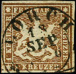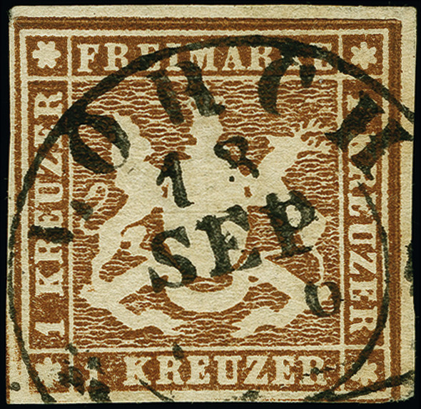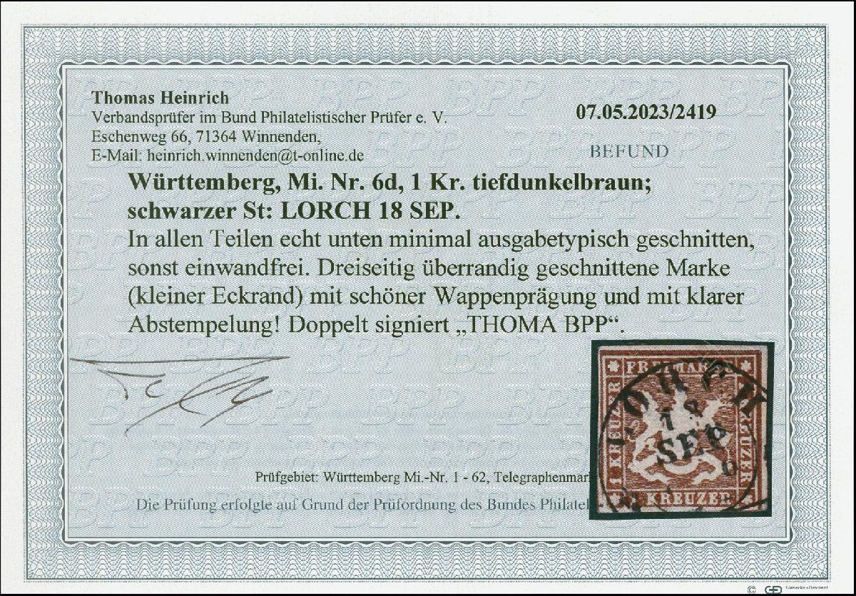 | Zusatzinformationen und Suchstichworte: | 382. Auktion Heinrich Köhler 18. – 23. September 2023 Los 4183 1 Kr. tiefdunkelbraun, farbfrisch, unten minimal ausgabetypisch, sonst dreiseitig überrandig geschnitten (kl. Eckrand!) mit schöner Wappenprägung, sauber entwertet "LORCH 18 SEP", sign. Thoma BPP sowie Befund Heinrich BPP (2023) Ausruf 150,00 EUR |