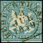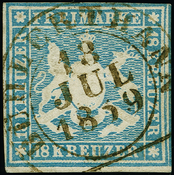 | Zusatzinformationen und Suchstichworte: | 382. Auktion Heinrich Köhler 18. – 23. September 2023 Los 4187 18 Kr. hellblau, farbfrisch und für diese Ausgabe sehr gut geschnitten, lediglich oben rechts leicht berührt, sonst voll- bis überrandig, rechts mit Teil der Nachbarmarke und unten mit schmalem Bogenrand, sehr schön entwertet durch zentrisch und klar aufgesetzten Steigbügelstempel "BÜHLERTHANN 18 JUL 1859". Ein besonders attraktives Stück in einwandfreier Erhaltung. Fotoattest Irtenkauf BPP (2019) Ausruf 400,00 EUR |