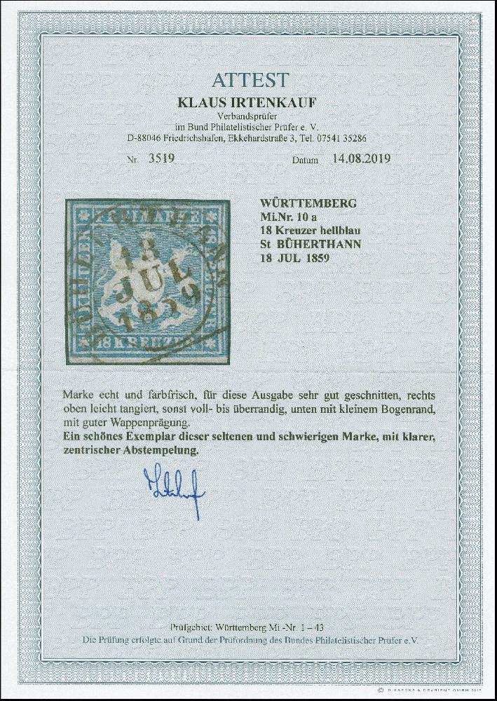| Prüfer: | Irtenkauf, Klaus (BPP (Bund Philatelistischer Prüfer)) |