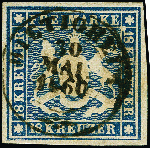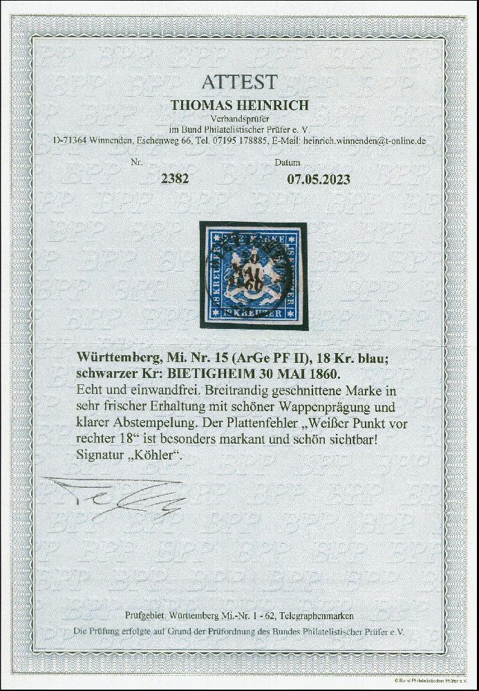 | Zusatzinformationen und Suchstichworte: | 382. Auktion Heinrich Köhler 18. – 23. September 2023 Los 4197 18 Kr. blau, farbfrisch und allseits breitrandig geschnitten mit schöner Wappenprägung, sauber, fast zentrisch gestempelt "BIETIGHEIM 30 MAI 1860", mit markantem Plattenfehler "weißer Punkt vor rechter 18", tadellos mit dem markanten Plattenfehler gut sichtbar, sign. Köhler sowie Fotoattest Heinrich BPP (2023) Ausruf 300,00 EUR |