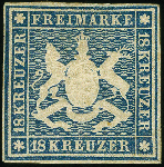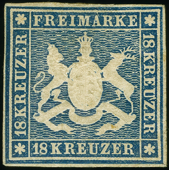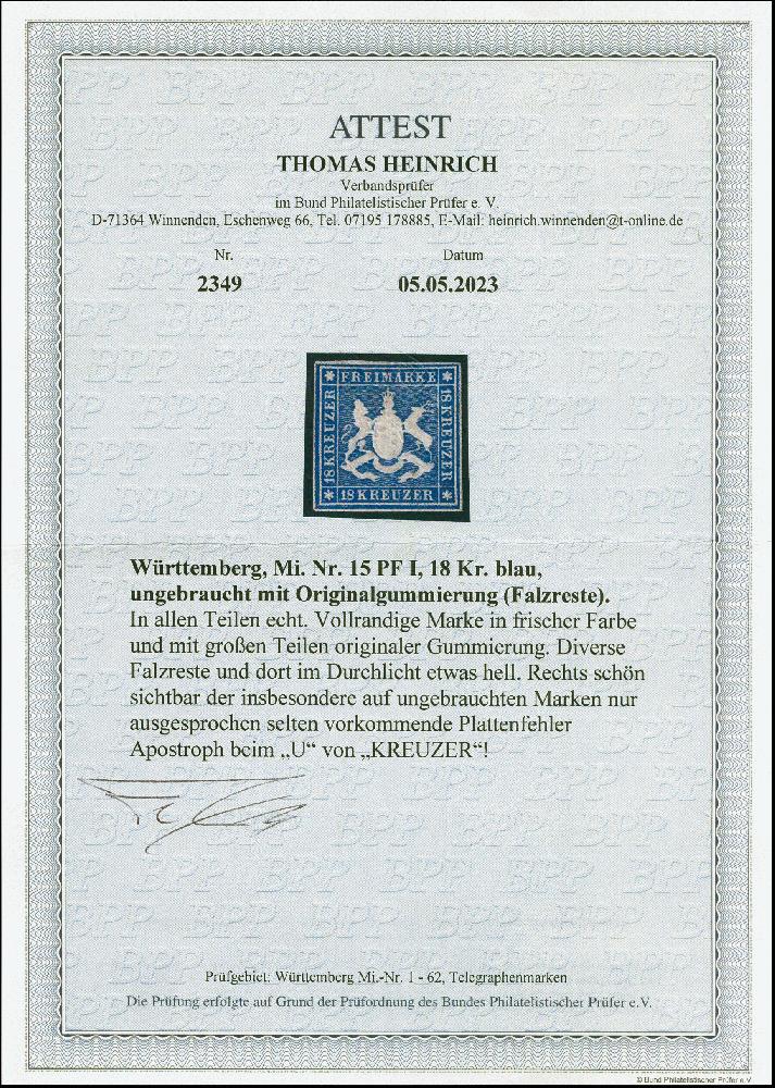 | Zusatzinformationen und Suchstichworte: | 382. Auktion Heinrich Köhler 18. – 23. September 2023 Los 4199 1859, 18 Kr. blau, farbfrisch und allseits vollrandig geschnitten, mit seltenem Plattenfehler "Apostroph am U von KREUZER", sauber ungebraucht mit großen Teilen der Originalgummierung, winzig und kaum merklich hell, sonst in tadelloser Erhaltung, eine mit dem Plattenfehler ungemein seltene Marke, mehrfach signiert sowie Fotoattest Heinrich BPP (2023) Ausruf 800,00 EUR |