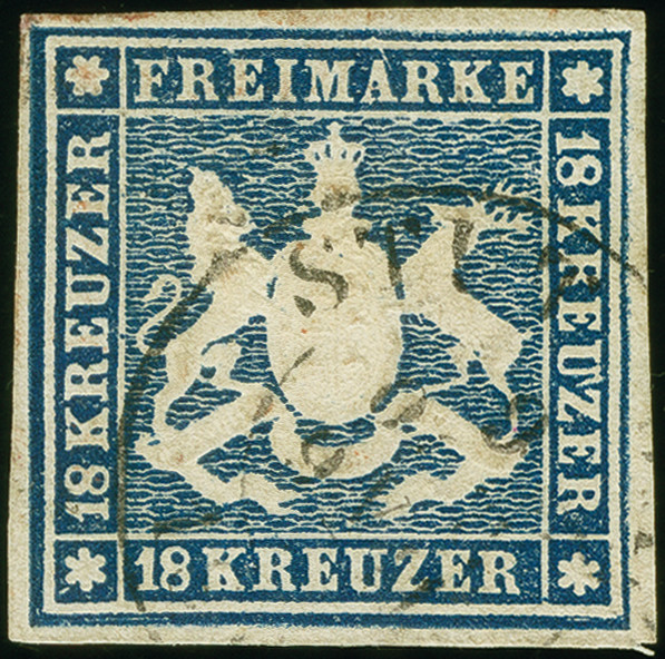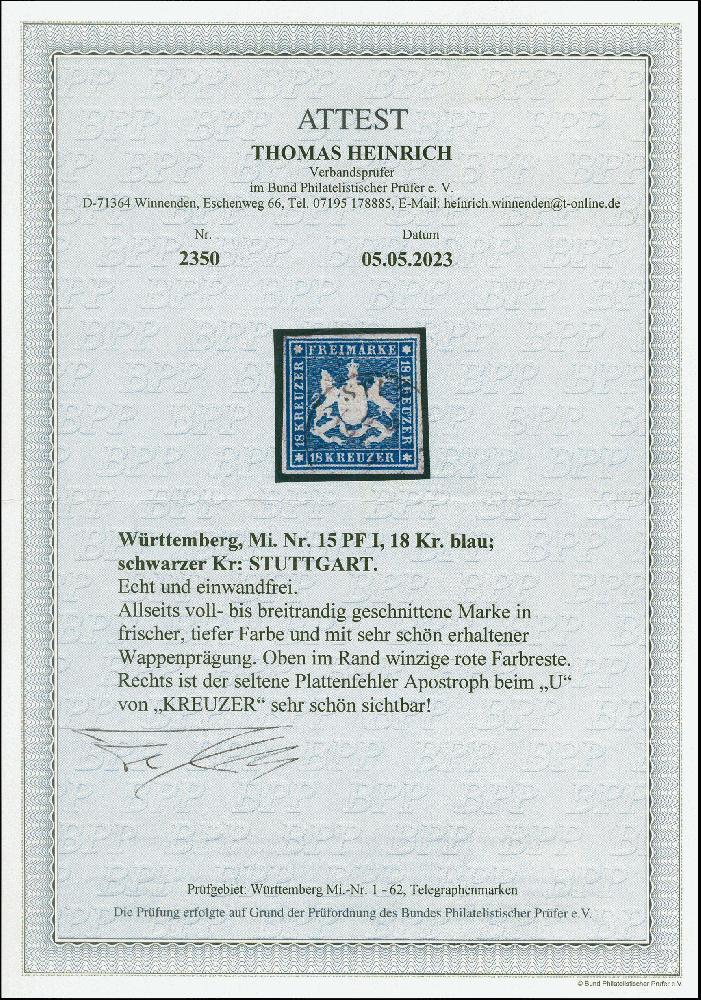 | Zusatzinformationen und Suchstichworte: | 382. Auktion Heinrich Köhler 18. – 23. September 2023 Los 4200 1859, 18 Kr. blau, farbfrisch in schöner tiefer Nuance, allseits voll- bis breitrandig geschnitten mit schön erhaltener Wappenprägung, mit seltenem Plattenfehler "Apostroph am U von KREUZER", sauber gestempelt, tadellos, Fotoattest Heinrich BPP (2023) Ausruf 600,00 EUR |