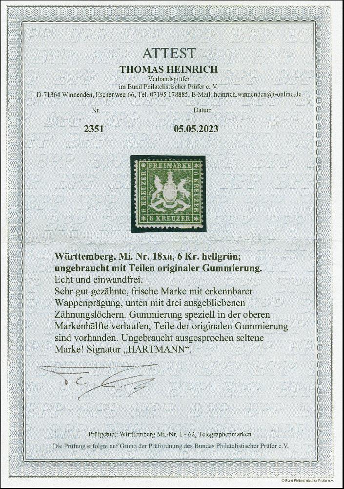 | Zusatzinformationen und Suchstichworte: | 382. Auktion Heinrich Köhler 18. – 23. September 2023 Los 4205 1860, Wappenausgabe, dickes Papier, 6 Kr. hellgrün, sehr schön farbfrisch und gezähnt, mit erkennbarer Wappenprägung, unten drei ausgebliebende Zähnungslöcher, sauber ungebraucht mit etwas verlaufenem Originalgummi, eine sehr attraktive und seltene Marke, u.a. sign. Hartmann sowie Fotoattest Heinrich BPP (2023) Ausruf 800,00 EUR |