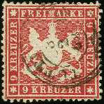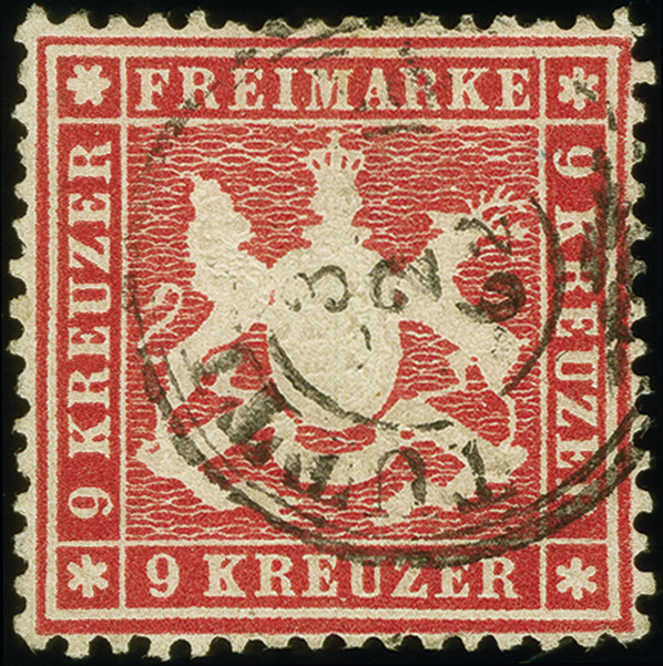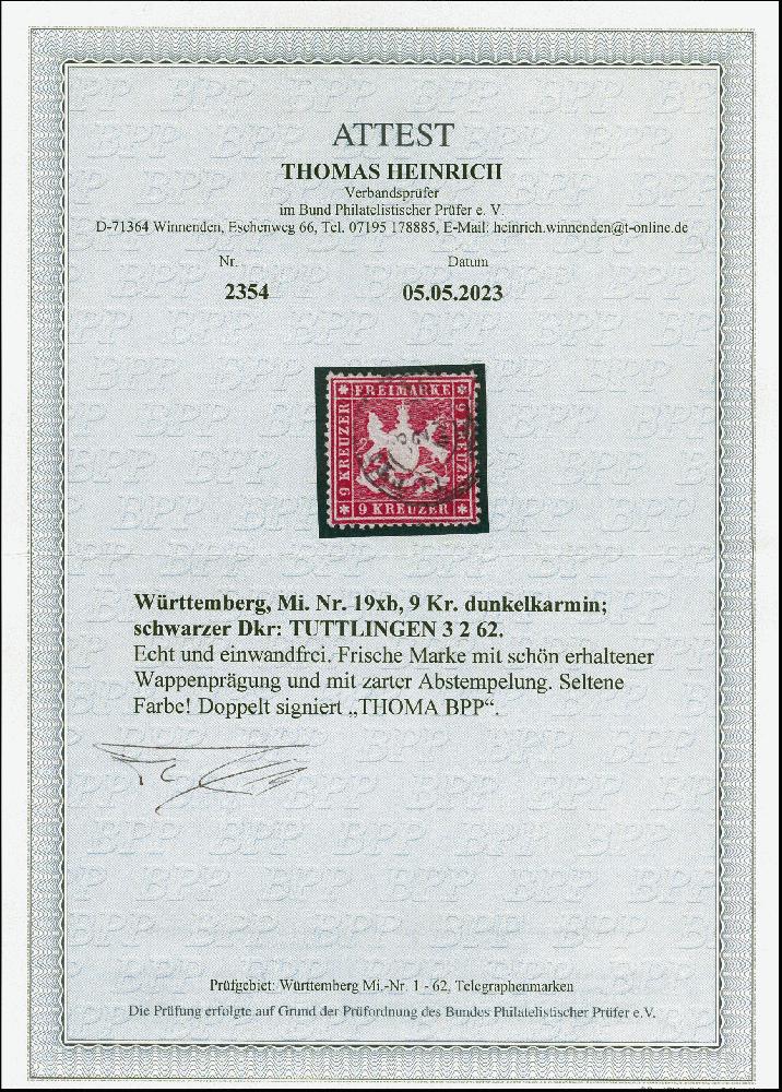 | Zusatzinformationen und Suchstichworte: | 382. Auktion Heinrich Köhler 18. – 23. September 2023 Los 4207 9 Kr. dunkelkarmin, farbfrisch und gut gezähnt sowie zentriert, mit sehr schöner Prägung, sauber und zart entwertet "TUTTLINGEN 3 2 62", tadellos, ein sehr schönes Stück der seltenen Farbe, sign. Thoma BPP und Fotoattest Heinrich BPP (2023) Ausruf 600,00 EUR |