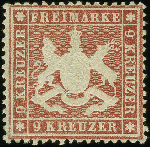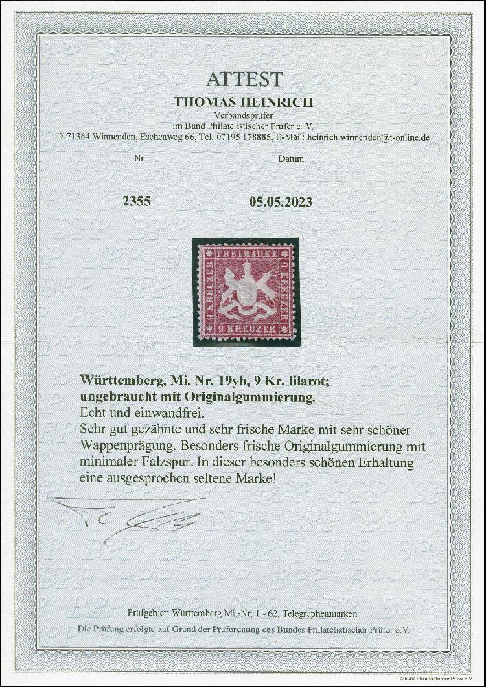 | Zusatzinformationen und Suchstichworte: | 382. Auktion Heinrich Köhler 18. – 23. September 2023 Los 4211 1861, Wappenausgabe, dünnes Papier, Wappen 9 Kr. lilrarot, sehr farbfrisch und sehr gut gezähnt sowie zentriert, mit sehr schöner Prägung, sauber, ungebraucht mit nur minimaler Falzspur, sicherlich eines der schönsten Stücke dieser seltenen Marke, Fotoattest Heinrich BPP (2023) Ausruf 500,00 EUR |