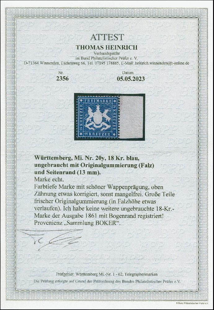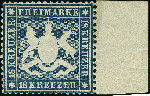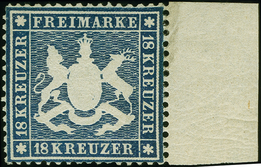 | Zusatzinformationen und Suchstichworte: | 382. Auktion Heinrich Köhler 18. – 23. September 2023 Los 4212 18 Kr. blau mit rechtem Seitenrand, besonders farbtief und gut gezähnt, lediglich oben links gering korrigiert, mit schöner erhabener Wappenprägung, sauber ungebraucht mit frischem Originalgummi, eine sehr seltene Marke, es ist kein weiteres ungebrauchtes Stück dieser Marke mit Bogenrand registriert, Fotoattest Heinrich BPP (2023) Ausruf 500,00 EUR |
