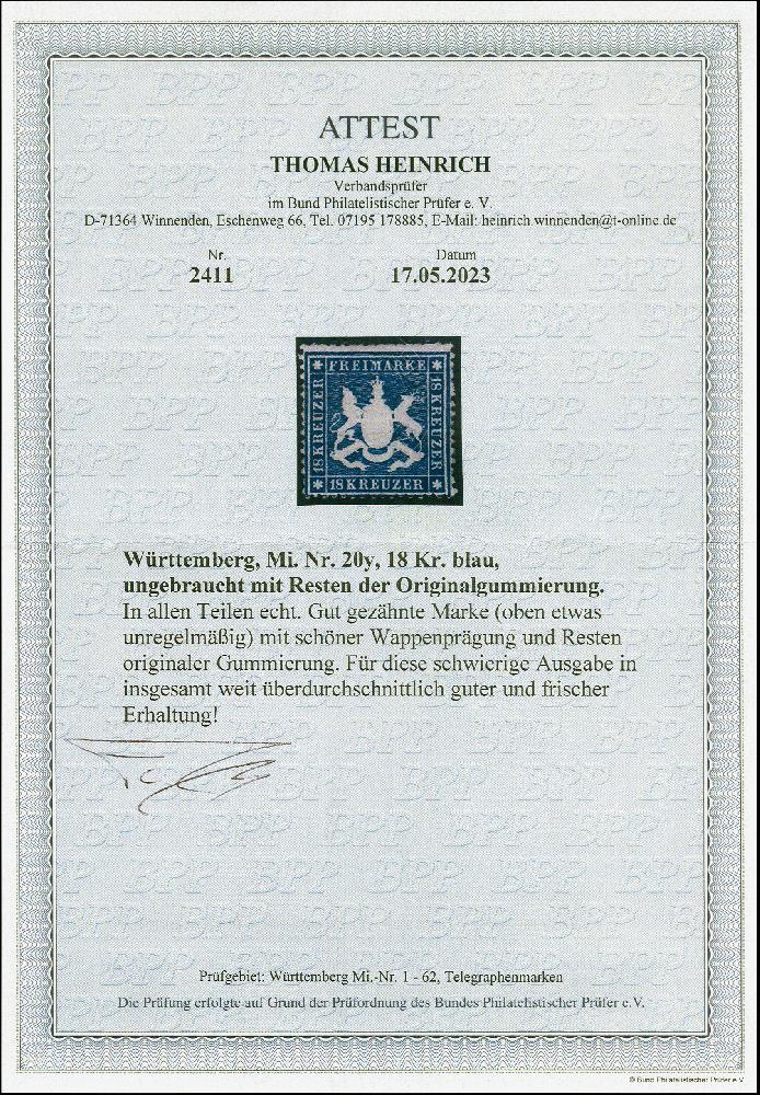 | Zusatzinformationen und Suchstichworte: | 382. Auktion Heinrich Köhler 18. – 23. September 2023 Los 4213 1861, 18 Kr. blau, sehr farbfrisch, ungebraucht mit Resten der Originalgummierung, oben etwas unregelmäßig, sonst gut gezähnte Marke mit schöner Wappenprägung in weit überdurchschnittlich guter Erhaltung. Ein schönes Exemplar dieser schwierigen Marke, unsigniert mit Fotoattest Heinrich BPP (2023) Ausruf 500,00 EUR |