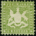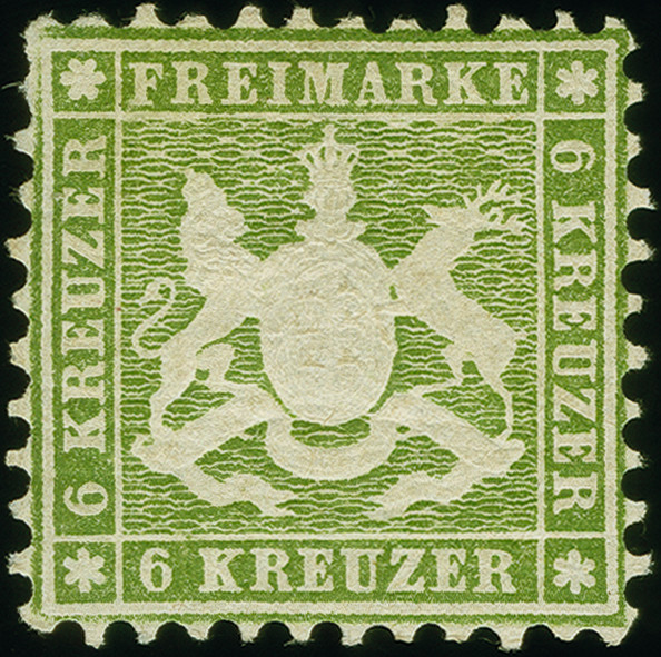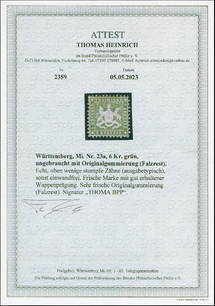 | Zusatzinformationen und Suchstichworte: | 382. Auktion Heinrich Köhler 18. – 23. September 2023 Los 4216 6 Kr. grün, farbfrisch und ausgabetypisch gezähnt, mit schön erhaltener Wappenprägung, sauber ungebraucht, sign. Thoma BPP sowie Fotoattest Heinrich BPP (2023) Ausruf 150,00 EUR |