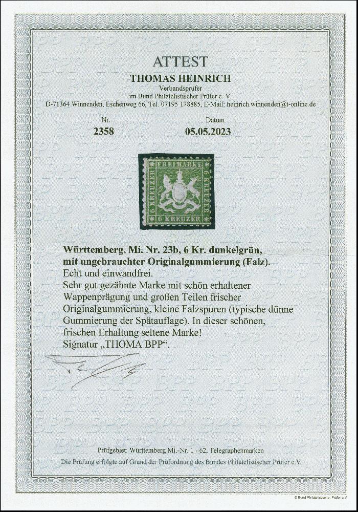 | Zusatzinformationen und Suchstichworte: | 382. Auktion Heinrich Köhler 18. – 23. September 2023 Los 4217 6 Kr. dunkelgrün, farbfrisch und sehr gut gezähnt, mit schön erhaltener Wappenprägung, sauber ungebraucht mit nur kleinen Falzspuren, in dieser frischen Erhaltung eine seltene Marke, sign. Thoma BPP sowie Fotoattest Heinrich BPP (2023) Ausruf 250,00 EUR |