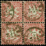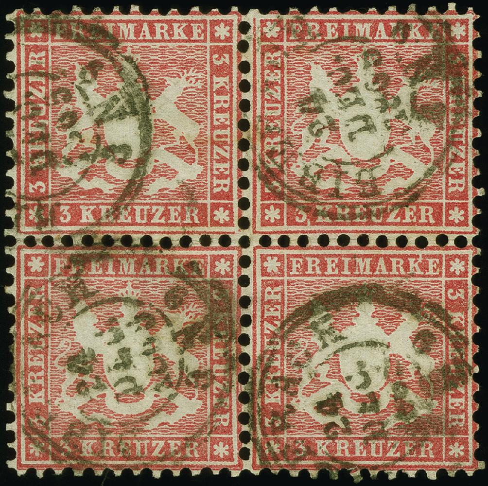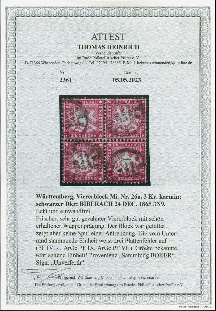 | Zusatzinformationen und Suchstichworte: | 382. Auktion Heinrich Köhler 18. – 23. September 2023 Los 4223 3 Kr. karmin im Viererblock, farbfrisch und sehr gut gezähnt, mit schön erhaltener Wappenprägung, sauber gestempelt "BIBERACH 24 DEC", etwas vorgefaltet, jedoch völlig intakt, die linke obere Marke mit Plattenfehler "Fuß des ersten E im linken Kreuzer verlängert", des Weiteren Arge-Plattenfehler VII und IX, die größte bekannte und sehr seltene Einheit, sign. Stock sowie Unverfehrt sowie Fotoattest Heinrich BPP (2023) Ausruf 400,00 EUR |
