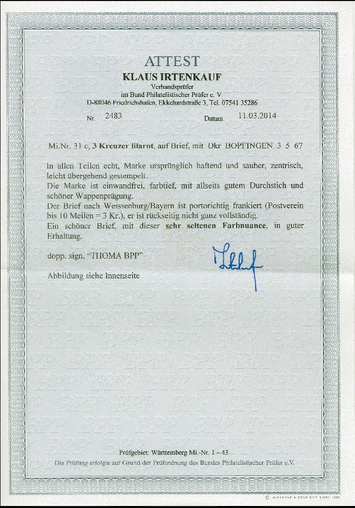 | Zusatzinformationen und Suchstichworte: | 382. Auktion Heinrich Köhler 18. – 23. September 2023 Los 4228 1865, Wappen 3 Kr. lilarot, sehr schön farbtief mit guter Wappenprägung und allseits gutem Durchstich, sauber mit DKr. "BOPFINGEN 3/5 67" auf Briefhülle nach Weissenburg mit Ankunftsstempel. Eine der seltensten Württemberg Marken auf Brief, wir haben nur wenige Einzelfrankaturen registriert, sign. Thoma BPP mit Fotoattest (1990; für die damalige b-Farbe) sowie Fotoattest Irtenkauf BPP (2014) Ausruf 1.200,00 EUR |