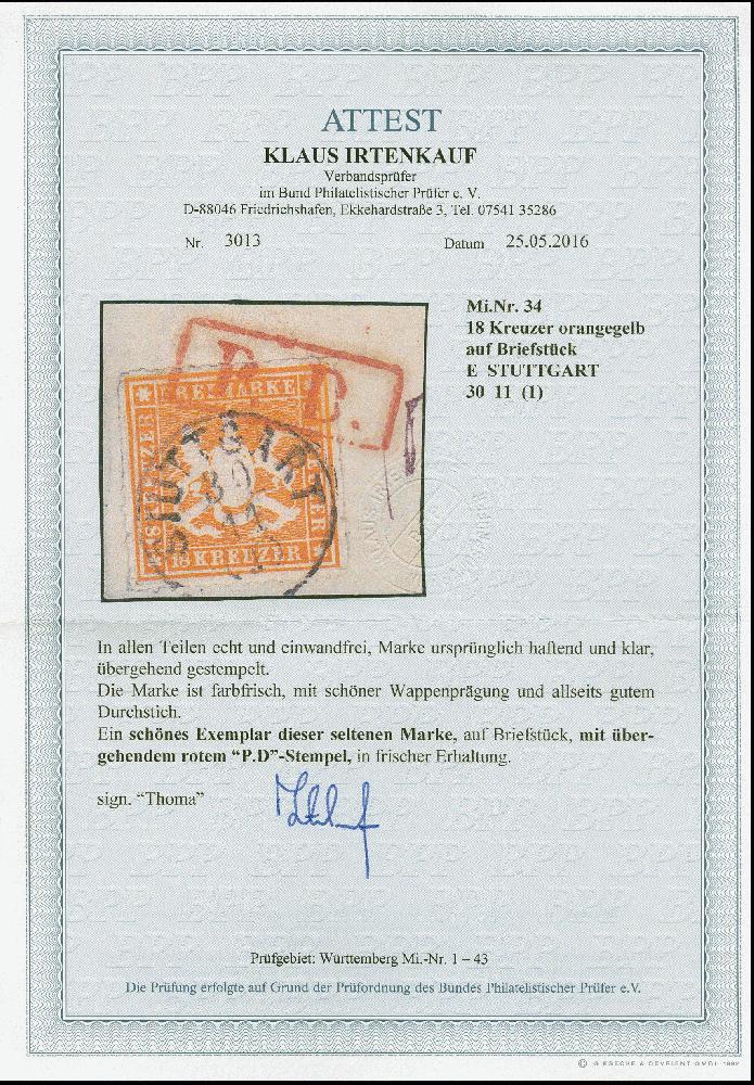| Zusatzinformationen und Suchstichworte: | 382. Auktion Heinrich Köhler 18. – 23. September 2023 Los 4233 18 Kr. orangegelb, farbfrisch und gut durchstochen, mit Doppelentwertung durch EKr. "STUTTGART 30/11 (1)" und rotem "P.D." auf Briefstück. Ein sehr schönes und in dieser Form seltenes Stück in einwandfreier Erhaltung. Fotoatteste Thoma BPP (1972) und Irtenkauf BPP (2016) Ausruf 300,00 EUR |