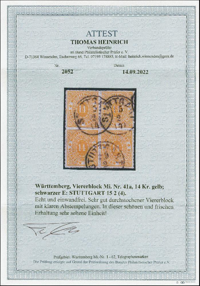| Zusatzinformationen und Suchstichworte: | 382. Auktion Heinrich Köhler 18. – 23. September 2023 Los 4236 14 Kreuzer gelb im Viererblock, farbfrisch und gut durchstochen, recht sauber entwertet durch EKr. "STUTTGART 24 2", tadellos. Eine seltene Einheit. Fotoattest Heinrich BPP (2022) Ausruf 300,00 EUR |