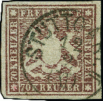 | Zusatzinformationen und Suchstichworte: | 382. Auktion Heinrich Köhler 18. – 23. September 2023 Los 4242 70 Kr. braunlila, farbfrisch und voll- bis breitrandig, sauber entwertet durch schwarzen EKr. "STUTTGART.II 12 2 (XI)". Rückseitiges Signum minimal durchschlagend, sonst einwandfrei. Signiert Pfenninger und Fotoattest Irtenkauf BPP (2019) Ausruf 1.500,00 EUR |