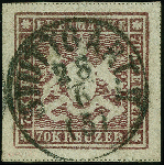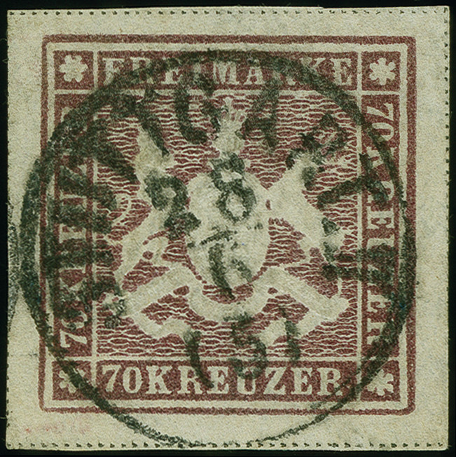 | Zusatzinformationen und Suchstichworte: | 382. Auktion Heinrich Köhler 18. – 23. September 2023 Los 4243 1873, 70 Kr. braunlila, Bogenfelder 6, farbfrisch und allseits breitrandig geschnitten, oben und unten mit voller, links und rechts mit Teilen der Trennlinie, mit guter Wappenprägung, sauber und fast zentrisch gestempelt "STUTTGART 28/6 (5), unten links, weit außerhalb des Markenbilds winziger Eckbug, ein schönes und ansprechendes Exemplar dieser seltenen Marke, sign. Drahn sowie Fotoattest Klinkhammer BPP (2023) Ausruf 1.000,00 EUR |