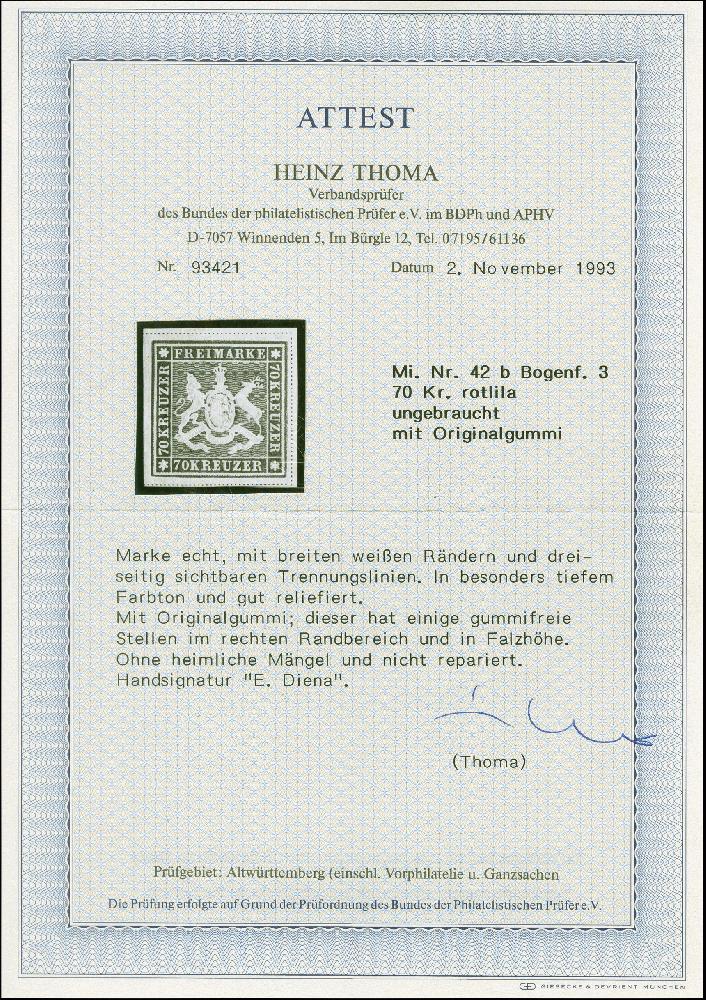 | Zusatzinformationen und Suchstichworte: | 382. Auktion Heinrich Köhler 18. – 23. September 2023 Los 4248 70 Kr. rotlila, sehr schöne, tiefe und frische Farbe, allseits breitrandig, ungebraucht mit frischem Originalgummi. Bleistiftsignatur, Fotoattest Thoma BPP (1993) Ausruf 500,00 EUR |