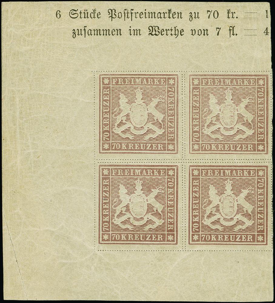 | Zusatzinformationen und Suchstichworte: | 382. Auktion Heinrich Köhler 18. – 23. September 2023 Los 4252 1873, 70 Kr. rotlila, Viererblock mit Bogenrändern an drei Seiten (15-27mm), oben großer Teil der Bogenrandinschrift, die linken Marken postfrisch, die rechten sauber ungebraucht, alle Marke farbfrisch und mit schöner Wappenprägung, links unten im Bogenrand verstärkter Bug, sonst tadellos. Insgesamt ein außerordentlich schönes Stück und mit der Bogeninschrift besonders attraktiv, sign. Thoma BPP sowie Fotoattest Heinrich BPP (2023) Ausruf 4.000,00 EUR |