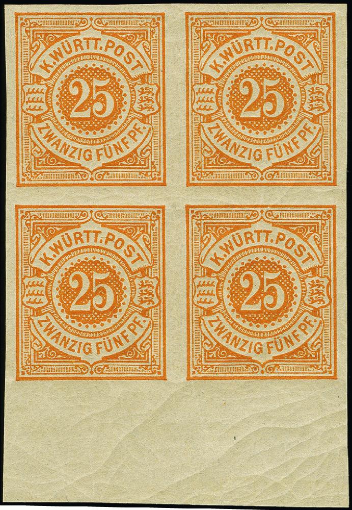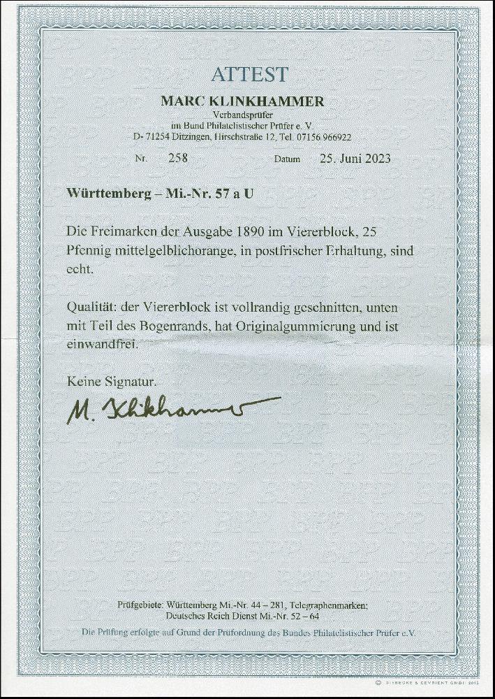 | Zusatzinformationen und Suchstichworte: | 382. Auktion Heinrich Köhler 18. – 23. September 2023 Los 4258 1890, 25 Pfg. mittelgelblichorange, allseits breitrandiger, ungezähnter Viererblock mit Unterrand, postfrisch, tadellos, Fotoattest Klinkhammer BPP (2023) Ausruf 200,00 EUR |