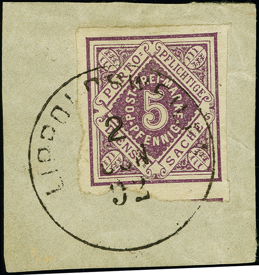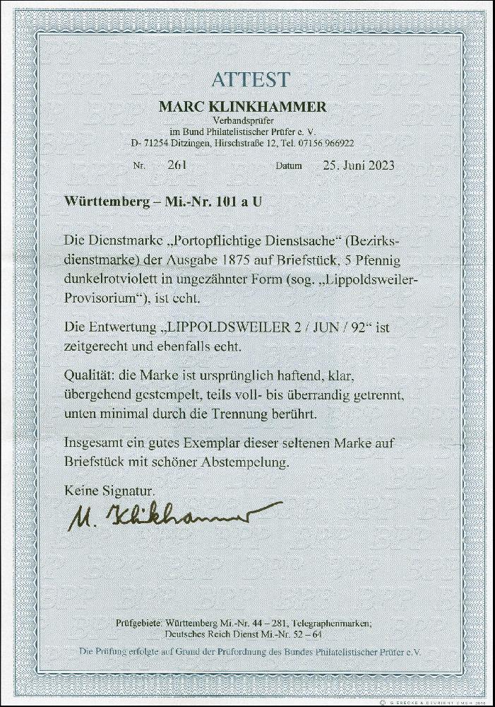 | Zusatzinformationen und Suchstichworte: | 382. Auktion Heinrich Köhler 18. – 23. September 2023 Los 4259 1875, 5 Pfg. violett, ungezähnt, sogenanntes "Lippoldsweiler-Provisorium", farbfrisch und allseits voll- bis breitrandig, nur unten winzig berührt, sauber mit EKr. "LIPPOLDSWEILER 2 JUN 92" auf Briefstück, ein sehr ansprechendes Exemplar dieser Württemberg-Seltenheit, Fotoattest Klinkhammer BPP (2023) Ausruf 800,00 EUR |