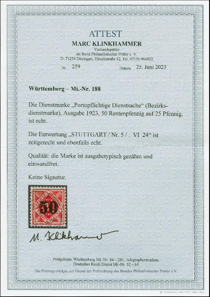 | Zusatzinformationen und Suchstichworte: | 382. Auktion Heinrich Köhler 18. – 23. September 2023 Los 4261 1923, Ziffern 50 auf 25 Pfg. rotorange, farbfrisch und ausgabetypisch gezähnt, sauber gestempelt "STUTTGART VI 24", tadellos, Fotoattest Klinkhammer BPP (2023) Ausruf 150,00 EUR |