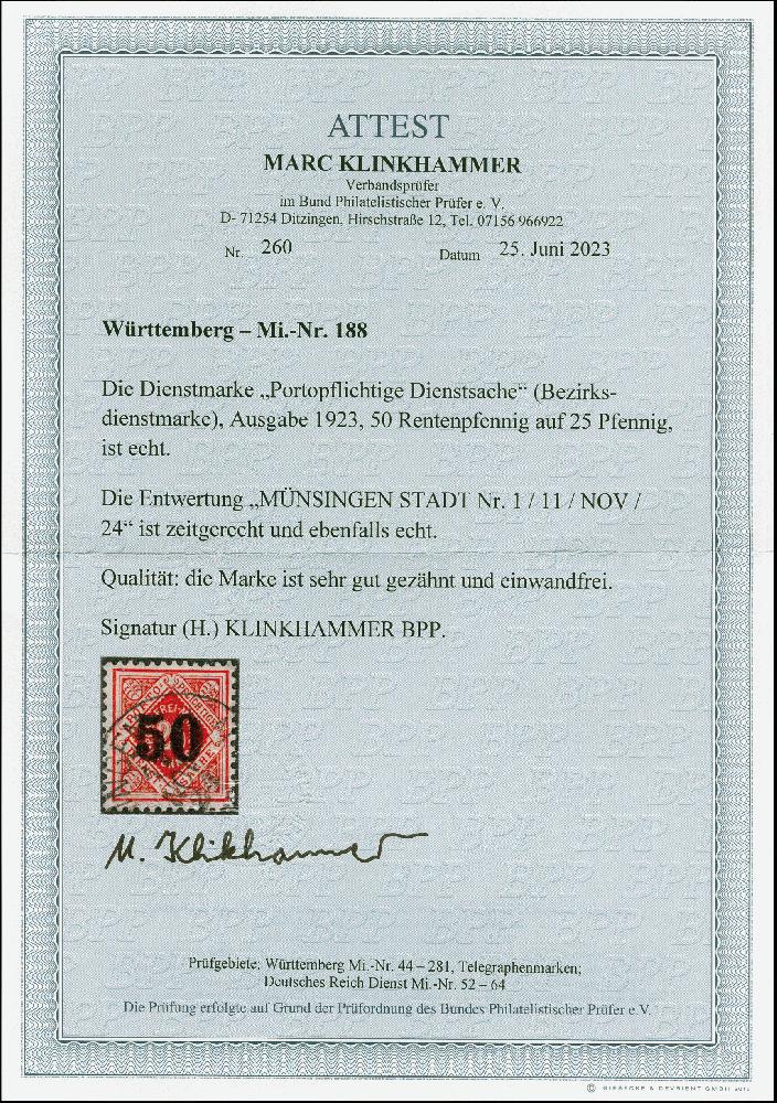 | Zusatzinformationen und Suchstichworte: | 382. Auktion Heinrich Köhler 18. – 23. September 2023 Los 4262 1923, Ziffern 50 auf 25 Pfg. rotorange, farbfrisch und sehr gut gezähnt, sauber gestempelt "MÜNSINGEN 11 NOV 24", tadellos, sign. Klinkhammer BPP mit Fotoattest (2023) Ausruf 150,00 EUR |