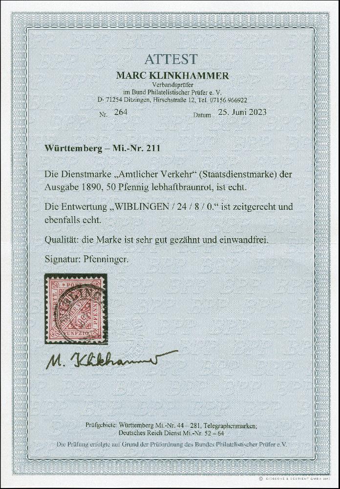 | Zusatzinformationen und Suchstichworte: | 382. Auktion Heinrich Köhler 18. – 23. September 2023 Los 4264 1890, 50 Pfg. lebhaftbraunrot, farbfrisch und sehr gut gezähnt, sauber und klar gestempelt "WIBLINGEN 24/8", tadellos, sign. Pfenninger und Fotoattest Klinkhammer BPP (2023) Ausruf 400,00 EUR |