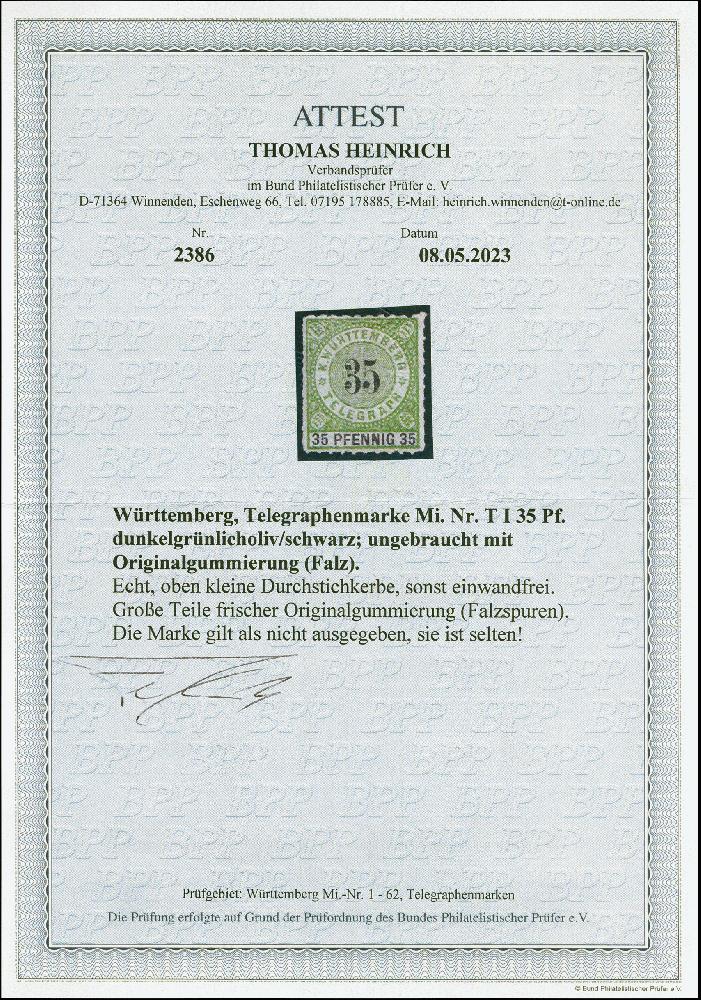 | Prüfgebiet: | Altdeutschland Württemberg Telegraphenmarken |