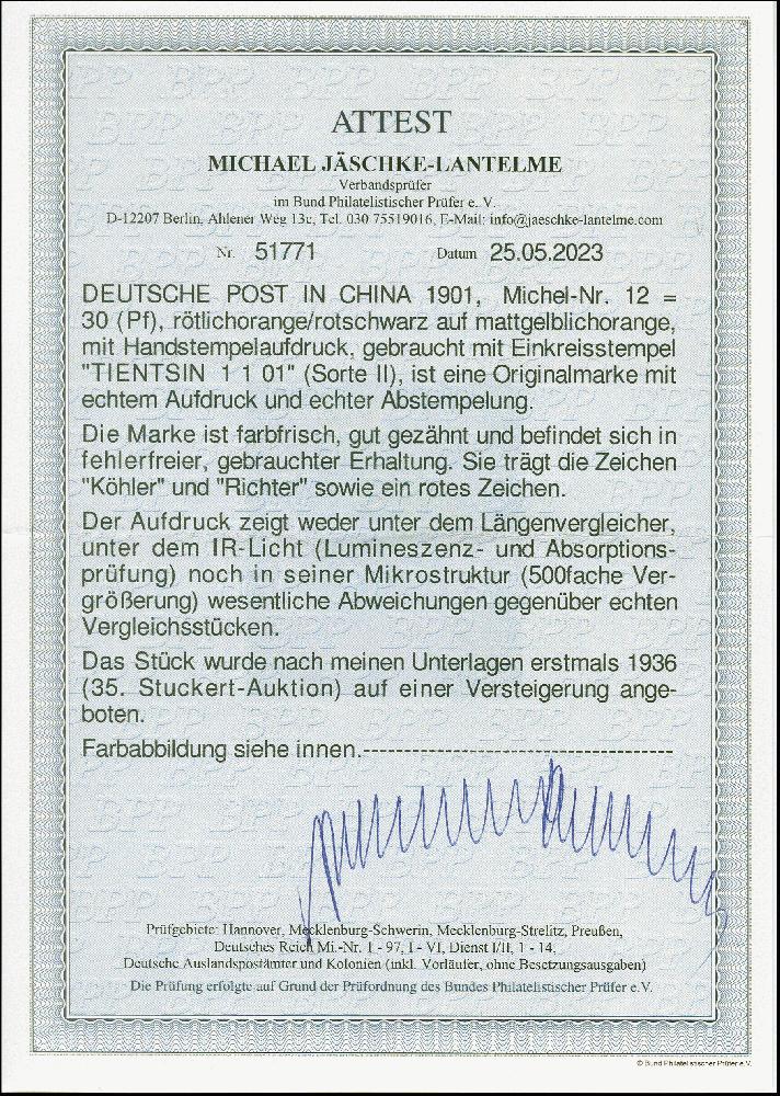 | Zusatzinformationen und Suchstichworte: | 382. Auktion Heinrich Köhler 18. – 23. September 2023 Los 3532 1900, Handstempel 30 Pfg., farbfrisch mit klarem Stempel "TIENTSIN DP a 1 1.01" (Sorte II), tadellos, sehr schönes Exemplar dieser nicht häufigen Marke, sign. Köhler und Richter und Fotoattest Jäschke-L. BPP (2023) Ausruf 1.000,00 EUR |