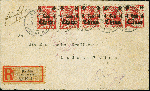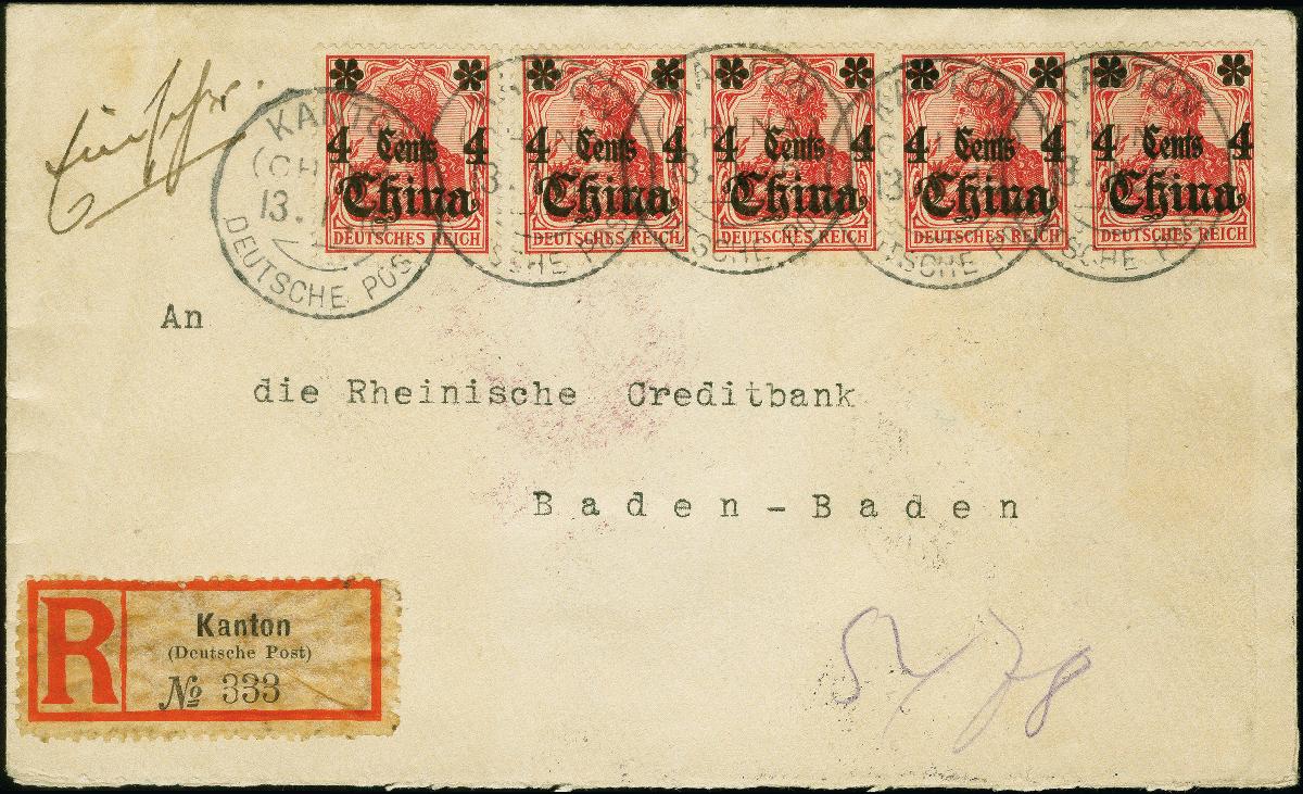 | Zusatzinformationen und Suchstichworte: | 382. Auktion Heinrich Köhler 18. – 23. September 2023 Los 3547 1916, 4 C. auf 10 Pfg. lebhaftrotkarmin mit Wasserzeichen, zwei waagerechte Paare und Einzelwerte je mit Stempel "KANTON DP.13.1.16" (mit Aushilfsjahreszahl) als portogerechte Mehrfachfrankatur auf R-Brief via Hankau und dem amerikanischen Postamt in Shanghai über New York nach Baden-Baden mit Ankunftsstempel. Der Umschlag mit Beförderungsspuren im Rand und zwei Marken je mit kurzem Zahn, sonst in guter Gesamterhaltung, in dieser Form seltene Post während des I. Weltkrieges, Fotoattest Jäschke-L. BPP (2013) Ausruf 150,00 EUR |