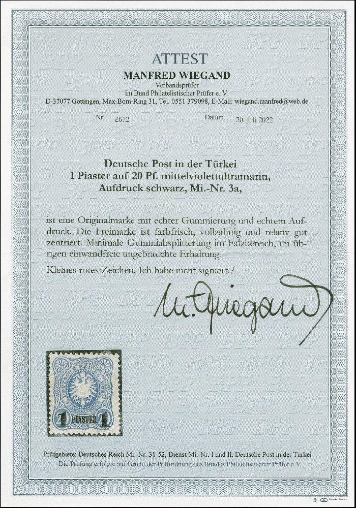 | Zusatzinformationen und Suchstichworte: | 382. Auktion Heinrich Köhler 18. – 23. September 2023 Los 3556 1884, 1Pia. auf 20 Pfg. mittelviolettultramarin, farbfrisch und gut gezähnt, sauber ungebraucht, tadellos, sign. und Fotoattest Wiegand BPP (2022) Ausruf 200,00 EUR |